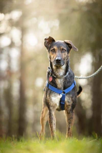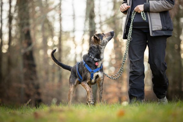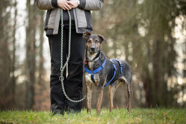 Tibo läuft sehr gut an der Leine, er passt sich seinem Leinenführer vom Tempo her sehr gut an. Bei Hundebegegnungen bleibt er meistens neutral. Manchmal kann es sein, dass er einen anderen Hund nicht mag und da knurrt oder bellt er mal. Lässt sich aber sehr schnell korrigieren.