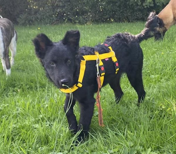 Tigris ist ein kleiner, schlanker, offener und sehr neugieriger Hundemann mit einer gehörigen Portion Selbstbewußtsein. Ein sehr süßer Knirps, der es jedoch faustdick hinter den großen Ohren hat. Seine lockige Haarpracht, sein Verhalten und seine Körperstruktur lassen vermuten, dass bei ihm vielleicht ein Mudi mitgemischt hat was bedeutet, daß der kleine Mann gefördert und geführt werden will. Jetzt Ende August ist er knapp über der 40 cm Marke und wird wohl auch nicht viel größer werden.