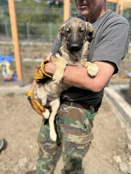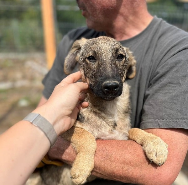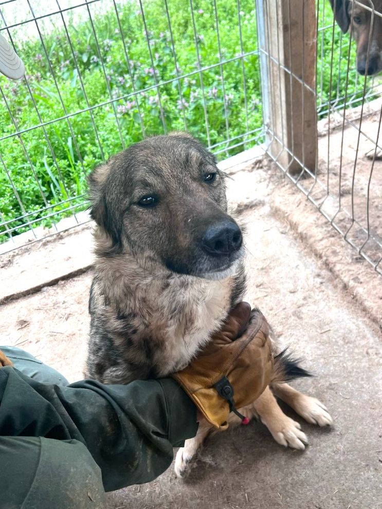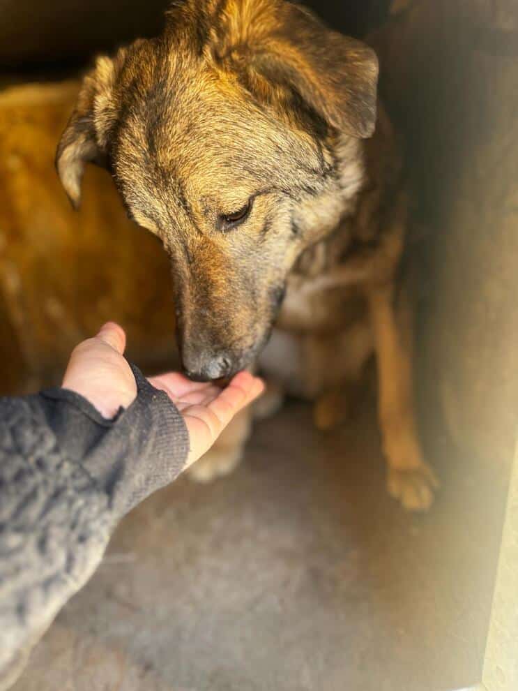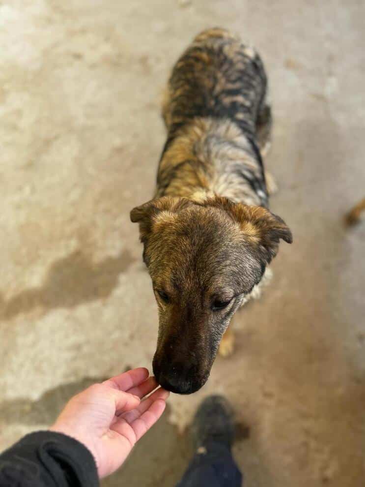 TIMBER begegnete uns freundlich und neugierig. Er braucht Zeit um Vertrauen zu schaffen, doch unsere Leckerchen konnten sein Interesse wecken. Er kam vorsichtig zu uns und nahm die Leckerlis aus den Fingern, dabei konnten wir ihn auch vorsichtig an der Schnauze berühren. Die menschliche Nähe ist für ihn sehr ungewohnt, aber er war mutig trotz seiner Unsicherheit.