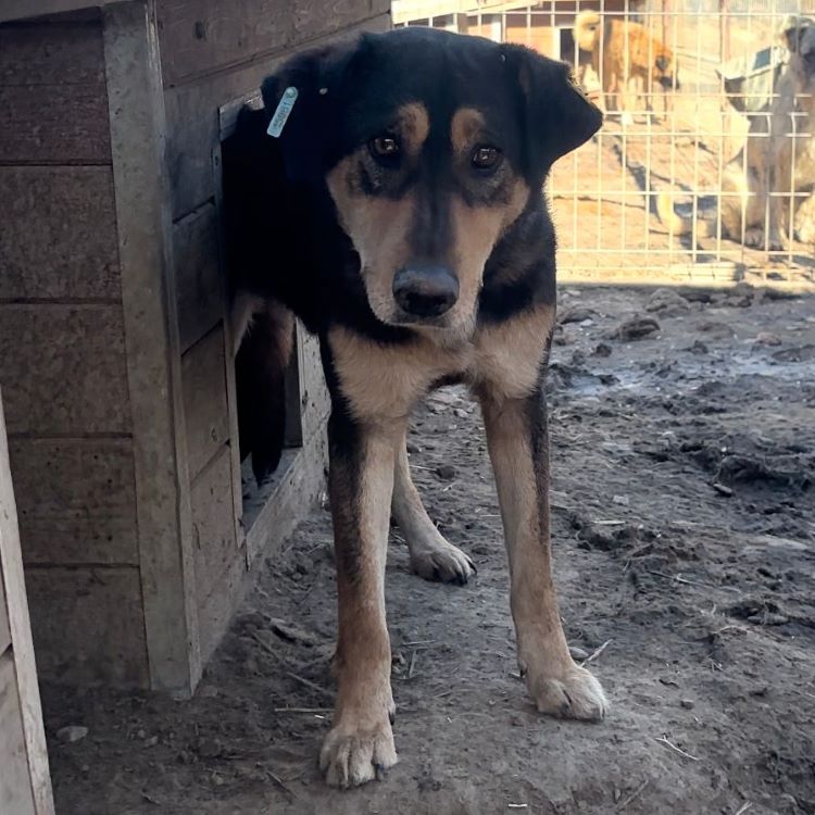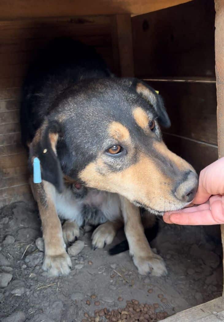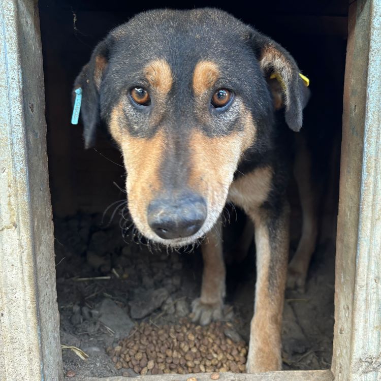 Zu uns war der sanftmütige TIMID durchweg freundlich. Im Schutz seiner Hütte nahm er gern unsere mitgebrachten Leckerlie und ließ sich dabei behutsam an der Schnauze berühren. Seine Zurückhaltung schreiben wir den seltenen Besuchen und dem Lärm und Trubel des Shelters zu – er kommt damit anscheinend seit 2 Jahren nur schlecht zurecht…