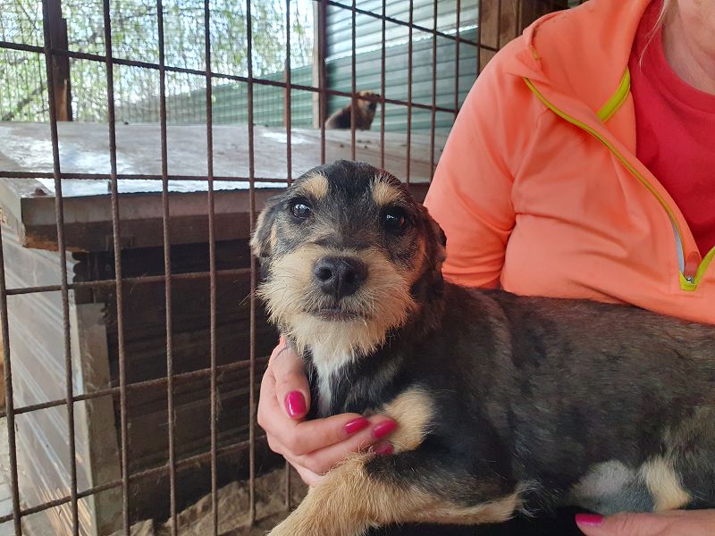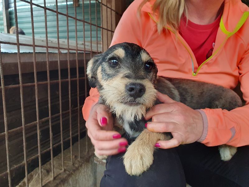 Tinta das süße Zwergschnauzer-Mix-Mädchen lag beim Besuch im April ’25 mit etlichen anderen Junghunden hinter der Hütte ihres Zwingers. Am liebsten wäre sie wahrscheinlich einfach da liegen geblieben, aber das konnten wir nicht zulassen, denn die kleine Maus hat eine Menge Potenzial zum Traumhund. Mit großen Augen und noch größeren Fragezeichen im Kopf schautes Motte uns an, ließ sich aber problemlos hochnehmen. Kein Strampeln, kein Knurren, einfach stillhalten und schauen, was da wohl jetzt passiert. Das zeigt uns: Auch wenn sie die Nähe von Menschen vielleicht noch nicht kennt, bringt sie alles mit, um sich zu einer tollen Begleiterin zu entwickeln.