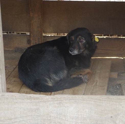 TINY sitzt in der Ecke der großen Hütte und hat Angst, sie hat wohl noch nicht viel Gutes von Menschen erlebt.