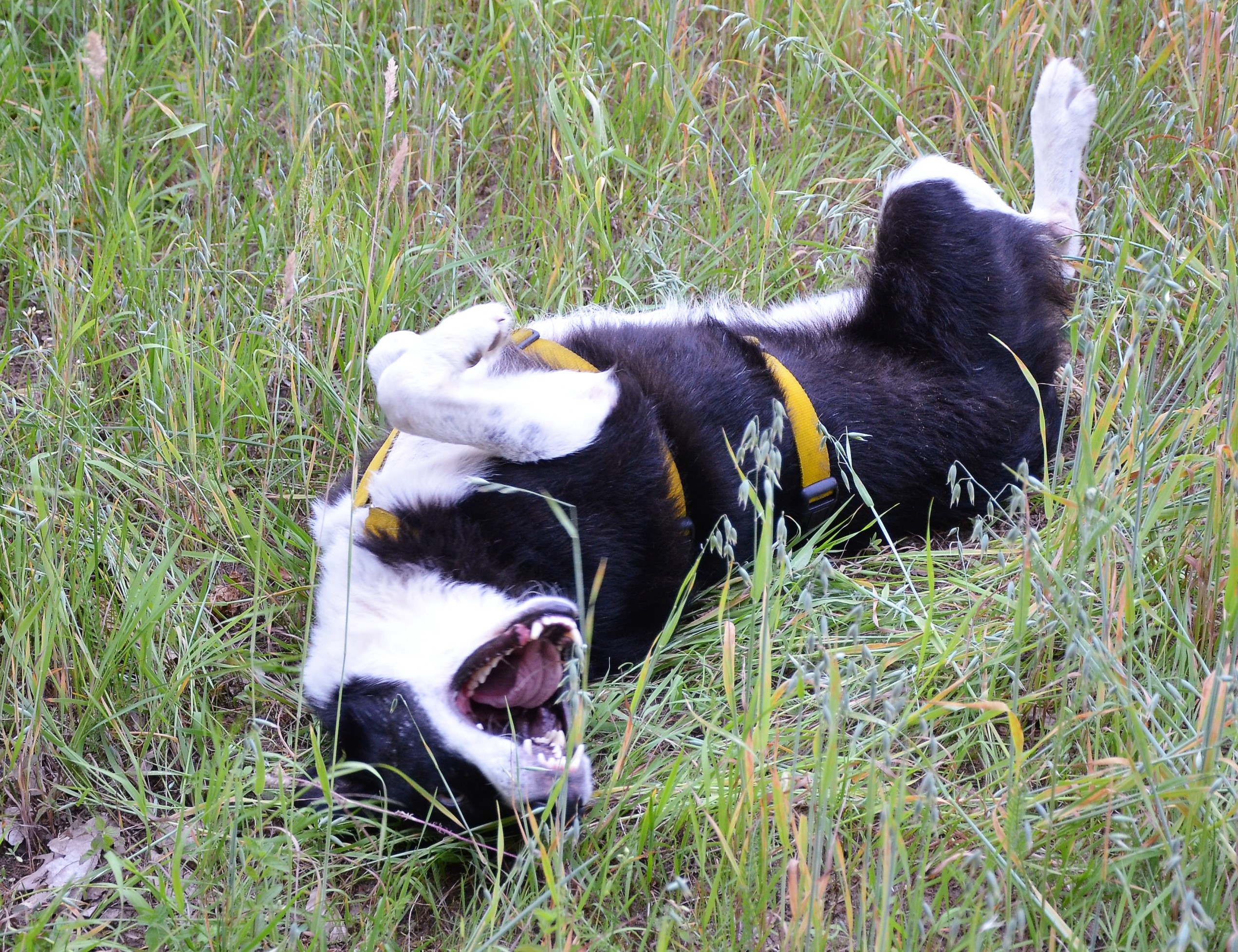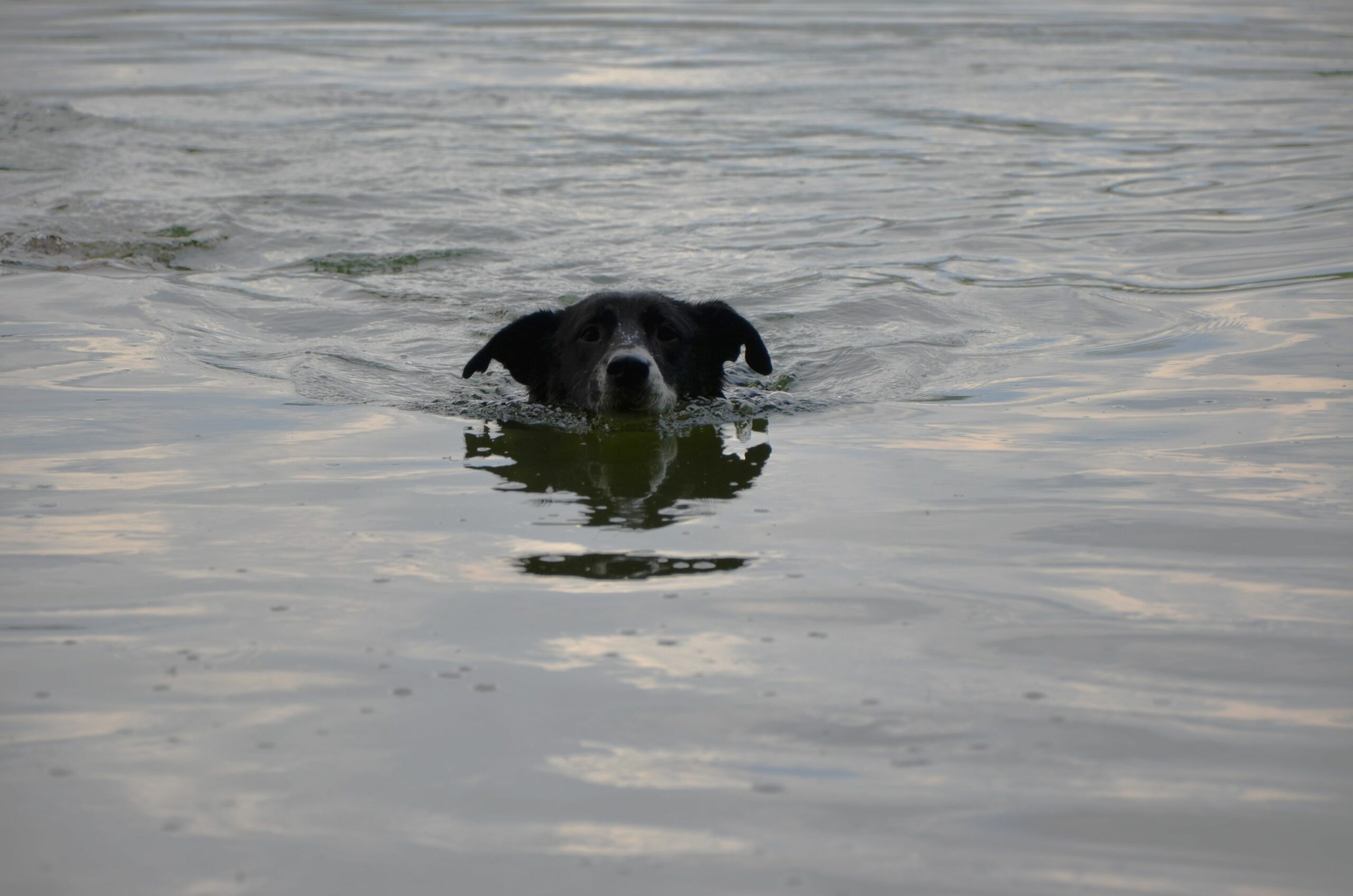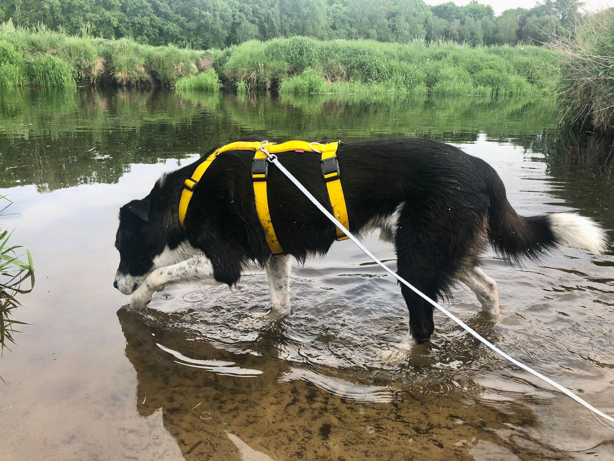 Auf Spaziergängen in belebten Gebieten guckt er sich zuerst alles genau an, bevor er weitergehen kann. Vieles macht ihm noch Angst. In Wald und Flur hingegen ist er sichtlich glücklich und läuft entspannt mit erhobener Rute durch die Gegend, wälzt sich zufrieden im Gras und plantscht im Wasser. Ich denke bald wird er das Seepferdchen absolvieren.