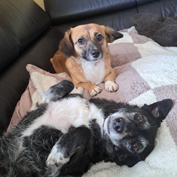 Tipsie sollte bei ihrer künftigen Familie nicht so viel allein Zuhause bleiben müssen, das kennt sie noch nicht und muss kleinschrittig geübt werden. In Hundegesellschaft klappt es hier für kurze Zeit schon ganz gut.