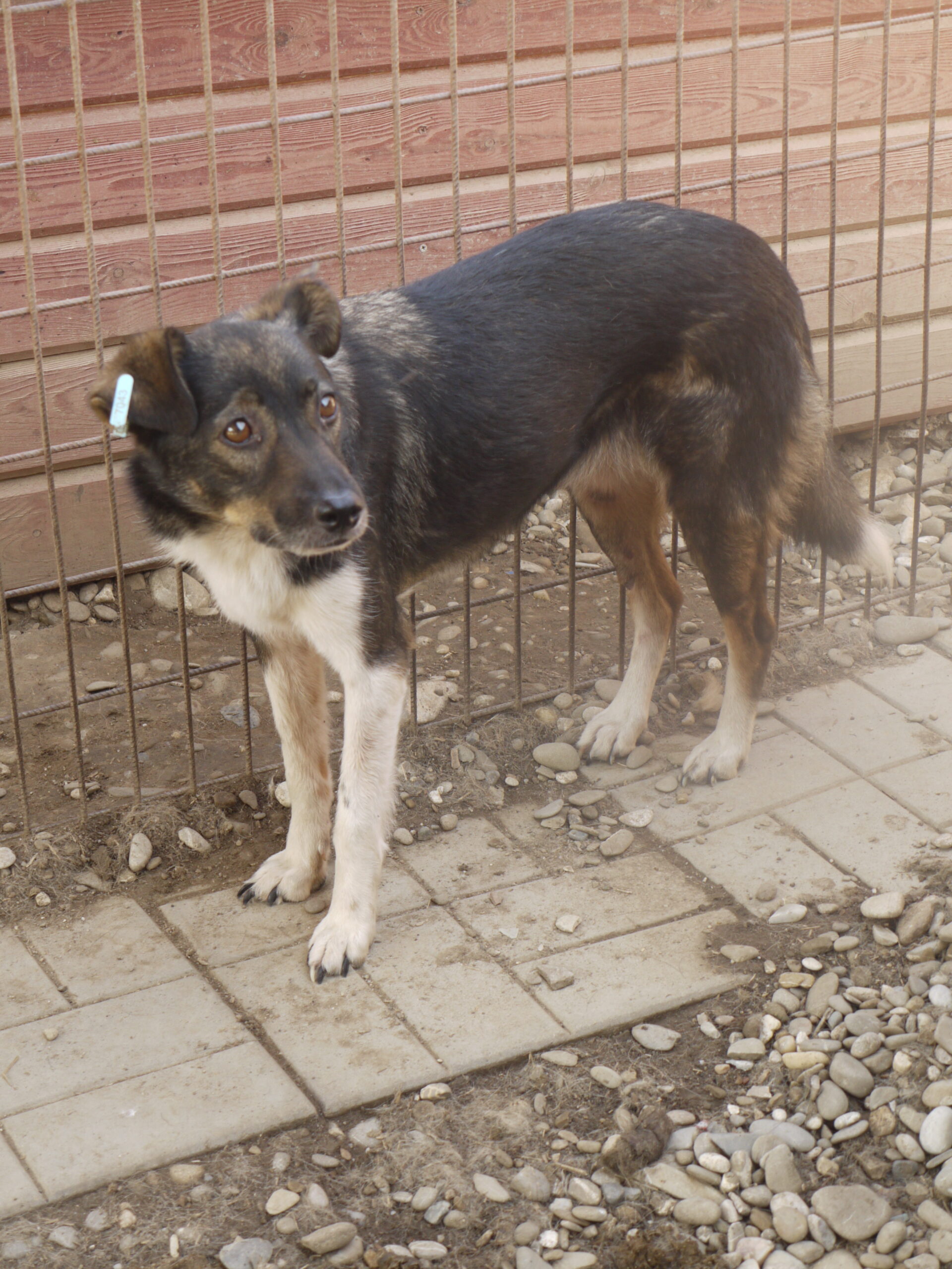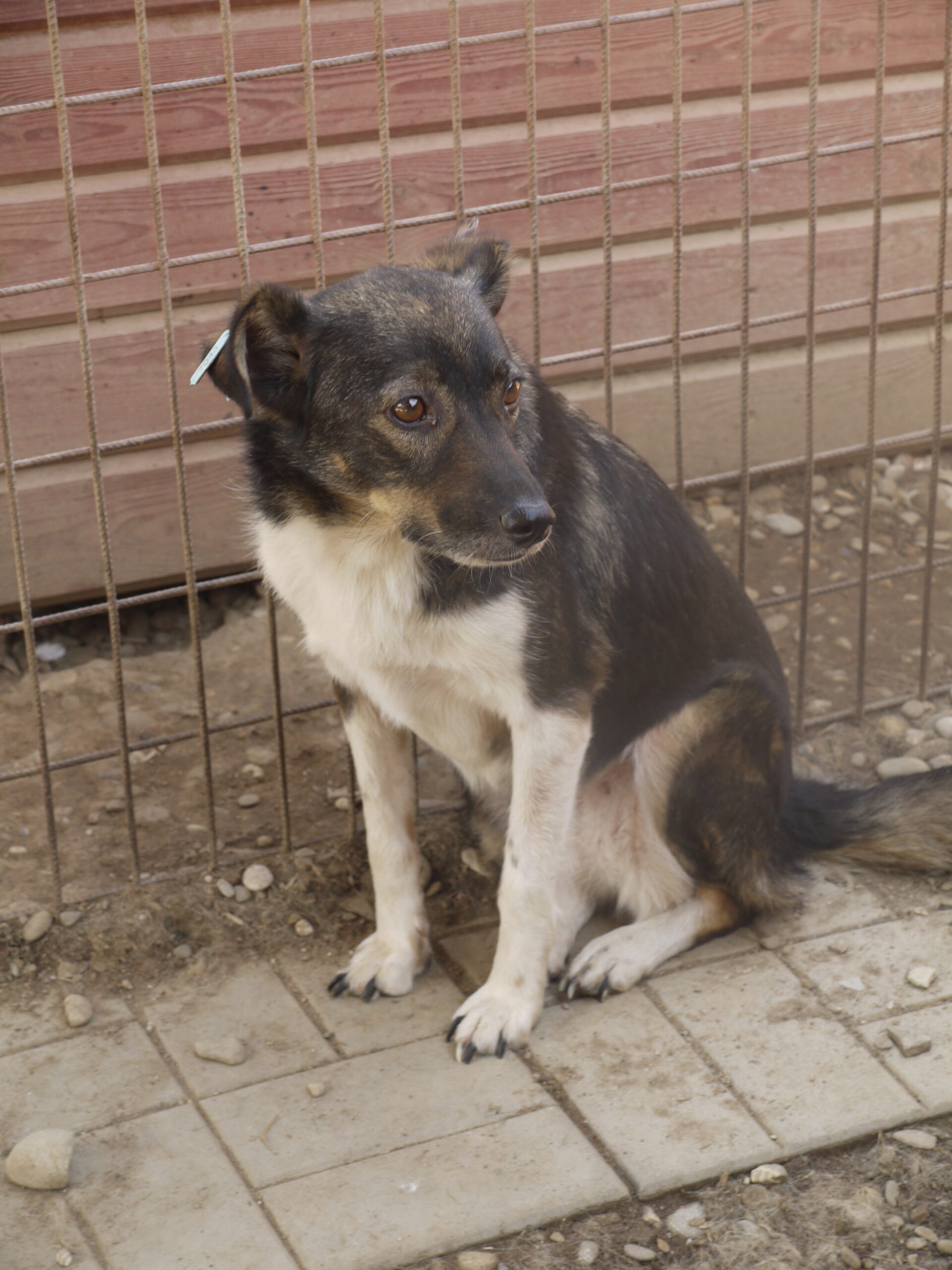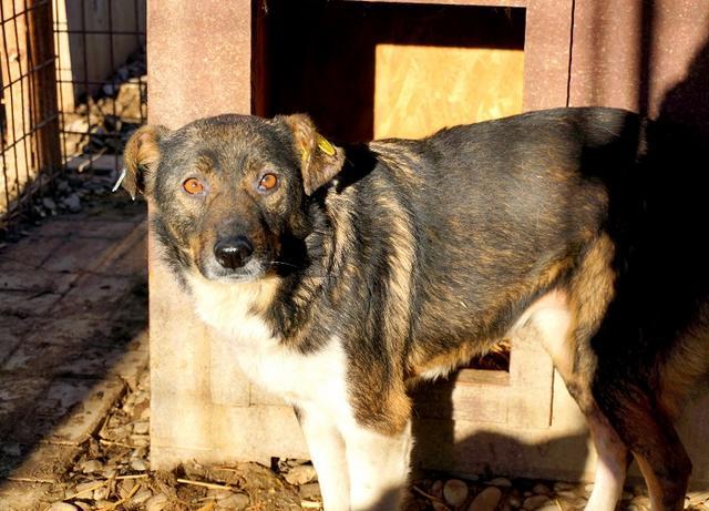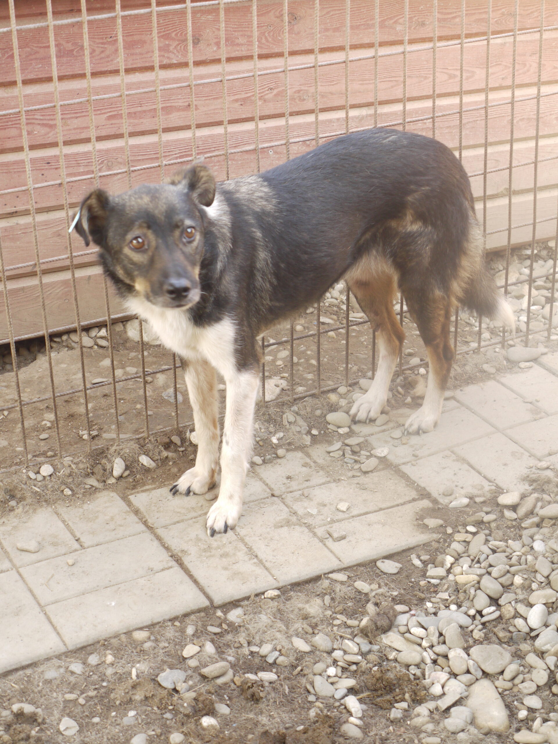 TOSHA ist in ihrem Kennel Mobbingopfer und inzwischen vie zu dünn. Sie kam sofort aus der Hütte, um zu fressen, und hat sogar Leckerli aus der Hand genommen. Am linken Vorderbein hat sie eine Wunde.