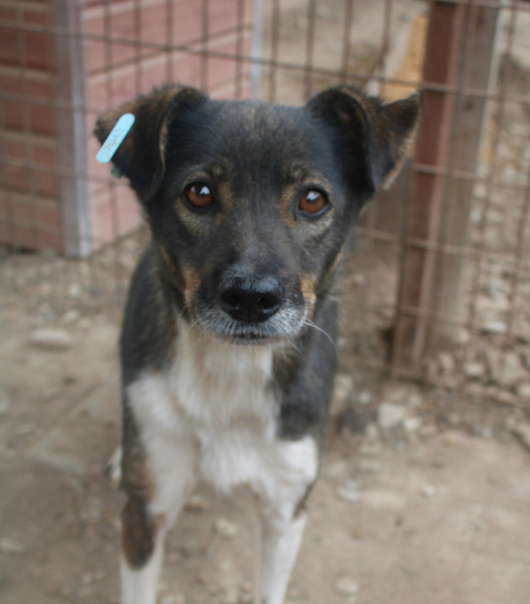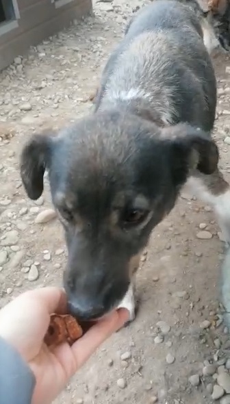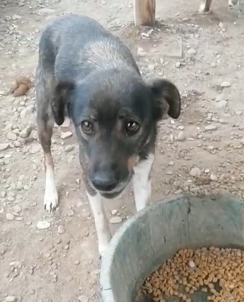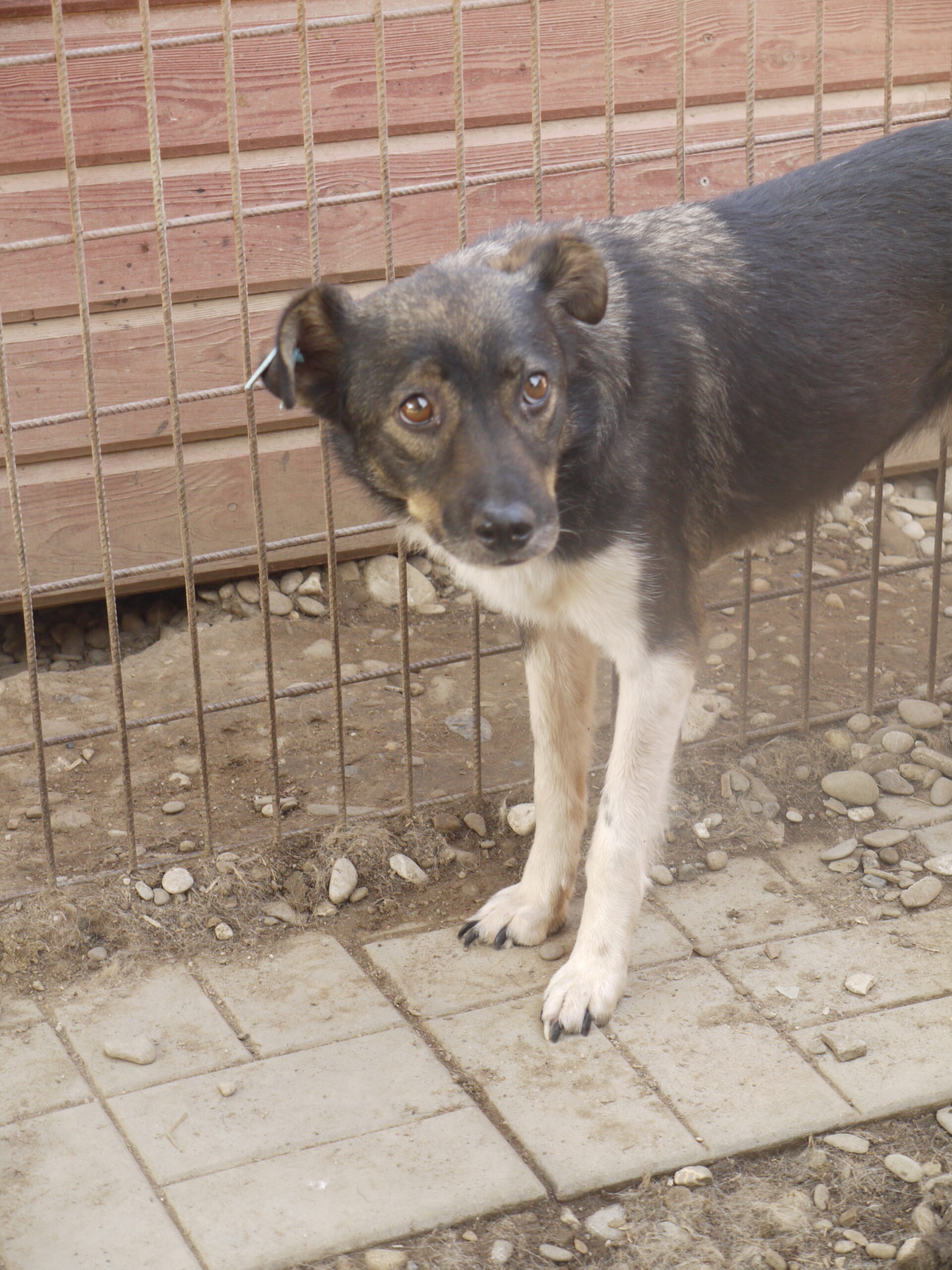 TOSHA ist in ihrem Kennel Mobbingopfer und inzwischen vie zu dünn. Sie kam sofort aus der Hütte, um zu fressen, und hat sogar Leckerli aus der Hand genommen. Am linken Vorderbein hat sie eine Wunde.