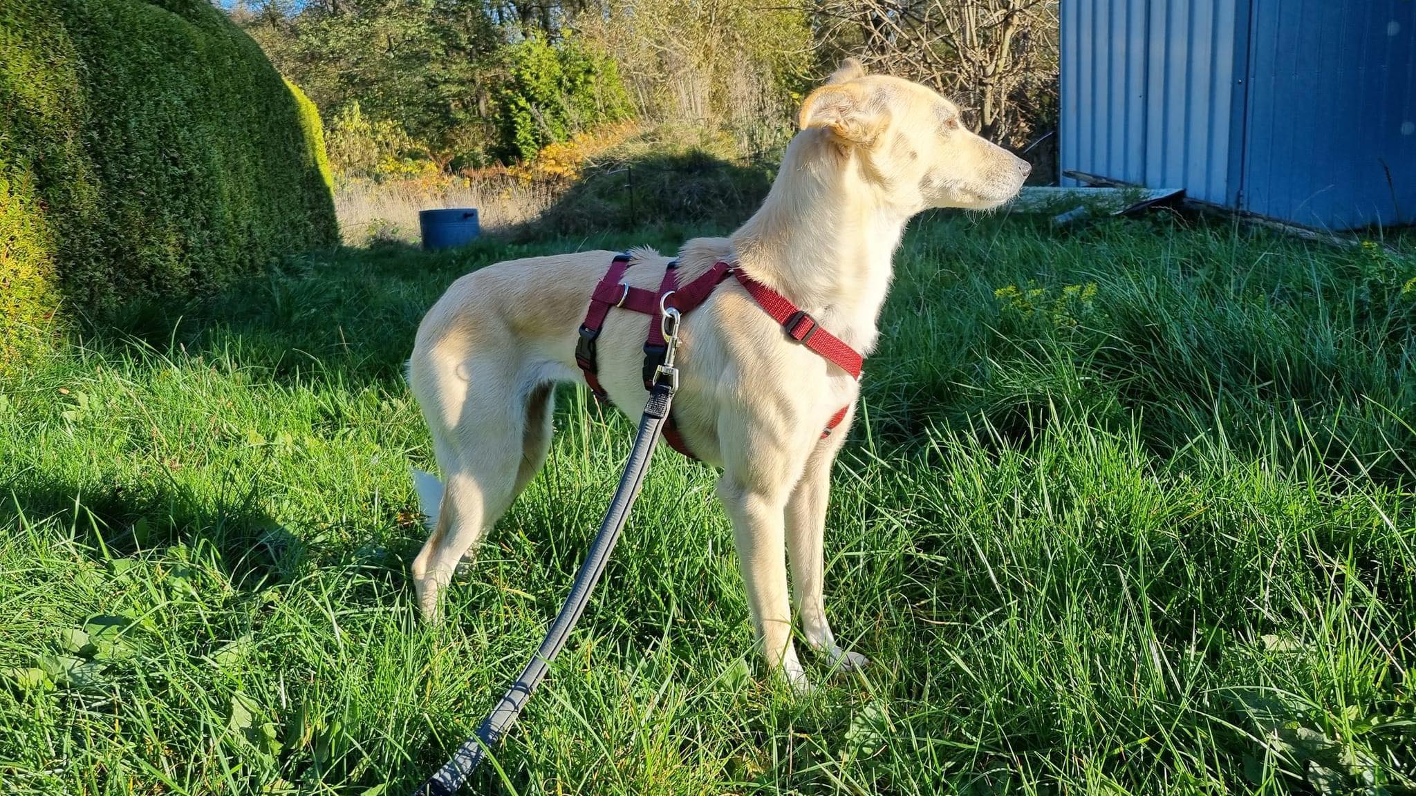 Der Garten ist toll und wir wohnen in ’ner ruhigen Gegend, das find ich super wir gehen jeden Tag tolle Wege und auch gerne weit, das mag ich sehr und ich zieh auch nicht an der Leine
