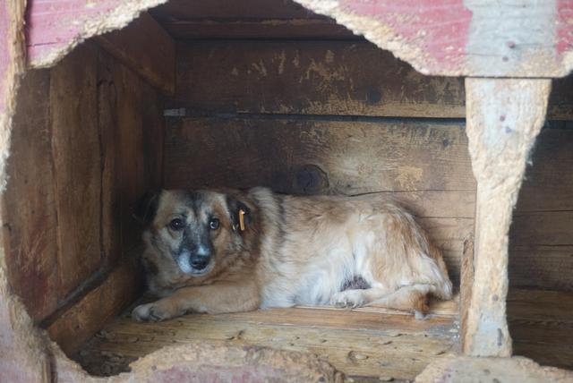 nicht anfassbar, ängstlich, weicht zurück, nur in der Hütte verträglich mit anderen Hunden braucht erfahrenes Zuhause mit anderen entspannten Hunden