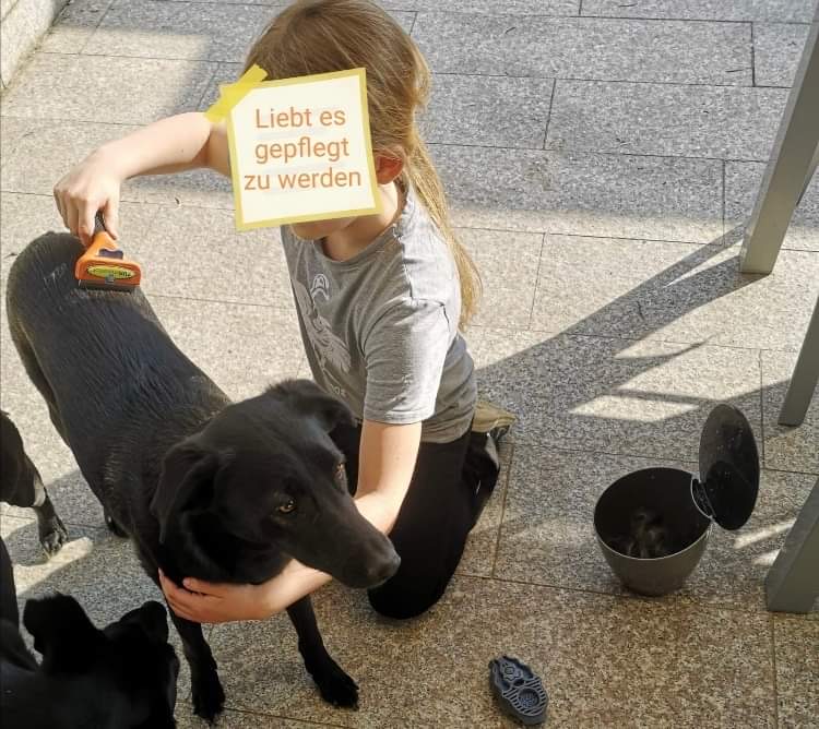 Er ist stubenrein und kennt das Hunde 1×1, (Sitz, Platz, ab auf deinen Platz, Leine laufen, alleine bleiben mit anderen Hunden) und wenn er Ruhe braucht, zieht er sich auf seinen Platz zurück.