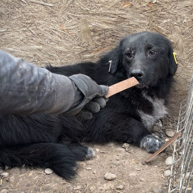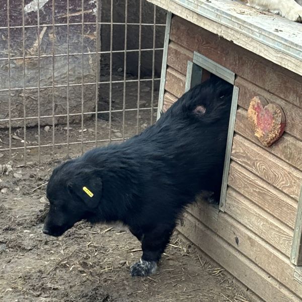 Unseren Kontaktaufnahmen wich er aus und legte sich schließlich in eine Ecke neben eine Hütte. Dort konnten wir ihn vorsichtig mit einer Leckerlie-Stange berühren. TYRONE machte uns sein Unbehagen über diese augenscheinlich ungewohnte Nähe jedoch mit etwas Brummeln deutlich, weshalb wir ihn nicht weiter bedrängten. Er ist noch neu im Shelter und muss sich mit der Situation erst noch zurecht finden. Während unseres restlichen Besuchs blieb er dort liegen und schien mit der Zeit etwas zu entspannen.