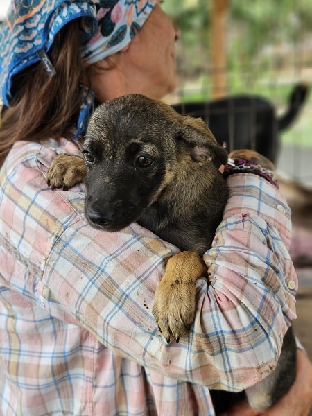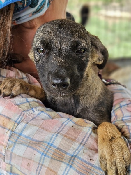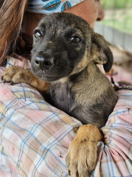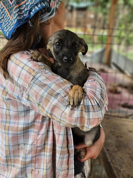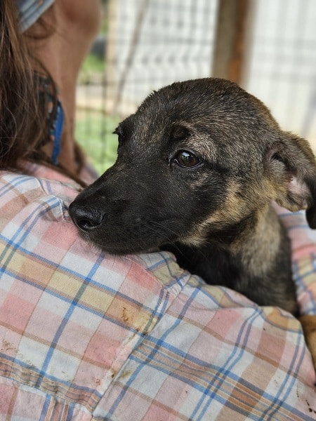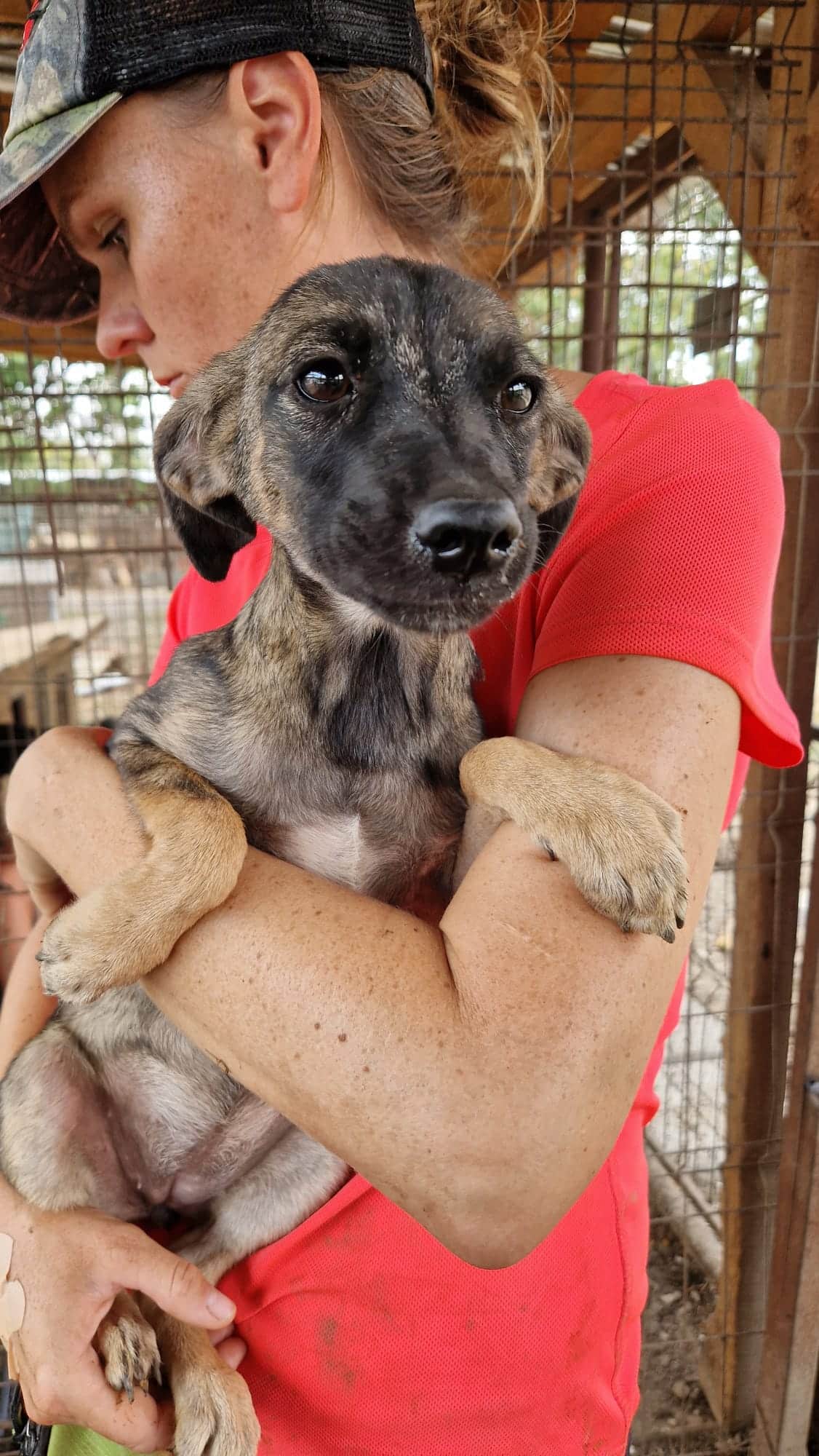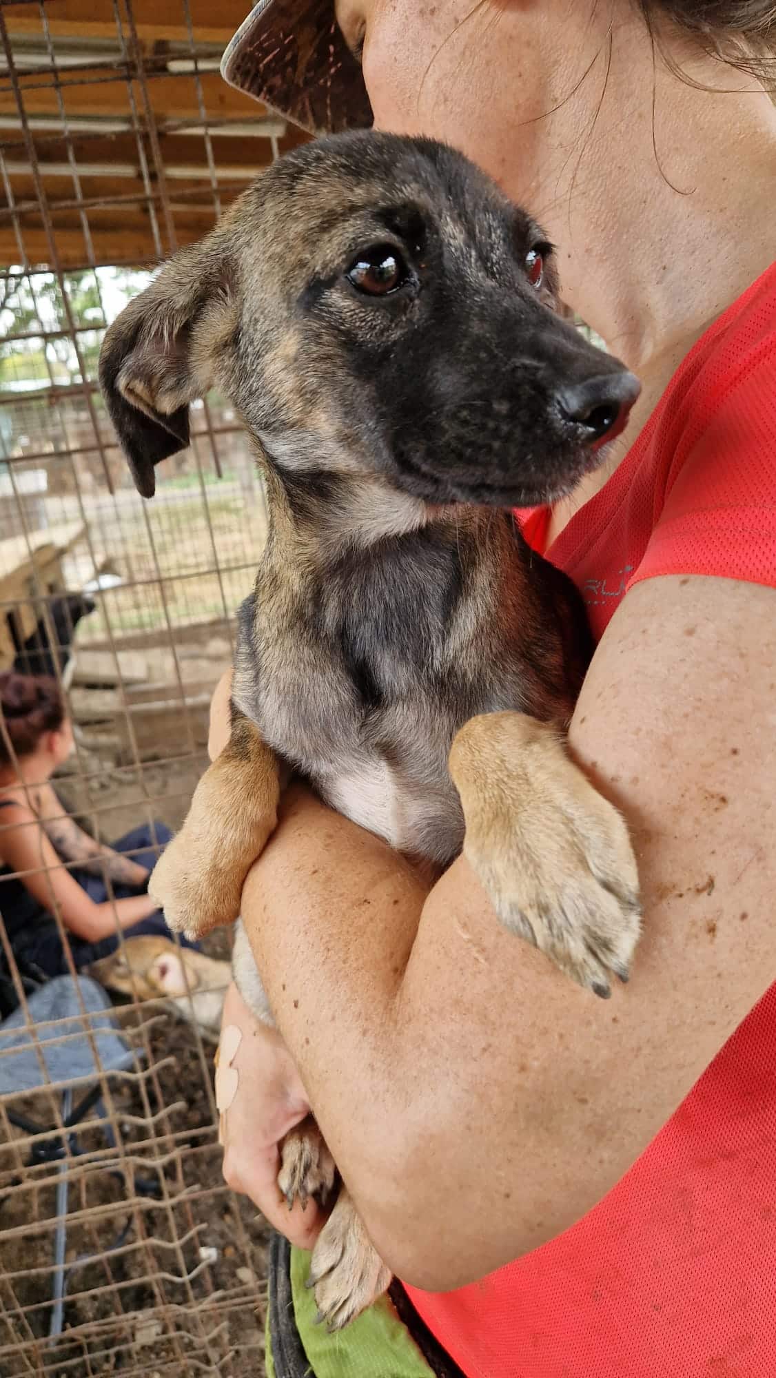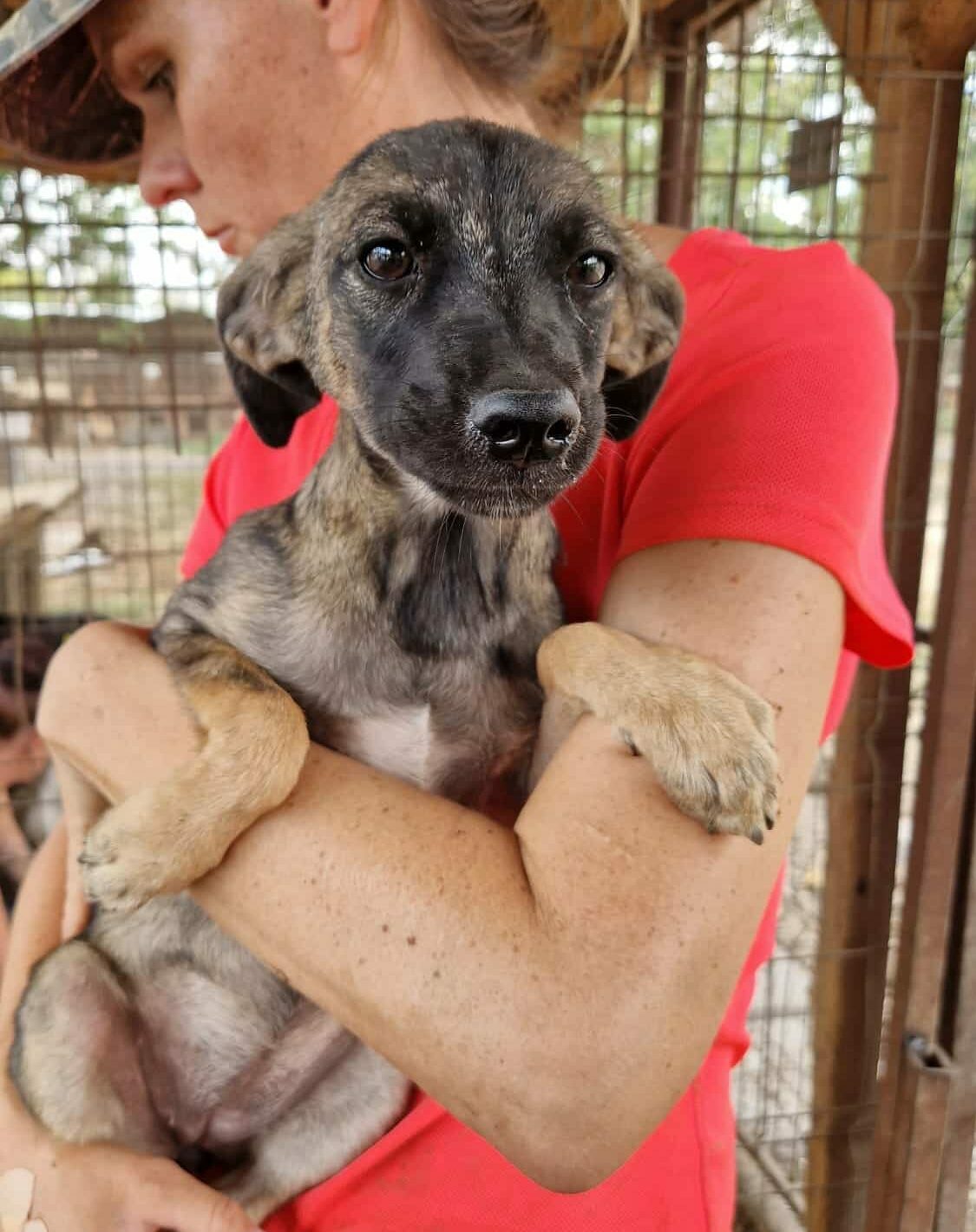 Die kleine zarte und liebe UBAH haben wir erst später in dem Kennel entdeckt, da sie sich hinter einer Hütte versteckt hat und dann doch neugierig nach vorne kam. Sie ist ein klein wenig schüchtern – kein Wunder, wenn man so auf sich alleine gestellt ist. Sie ließ sich ganz lieb auf den Arm nehmen und streicheln, kennt es nur halt nicht und wirkt als Kleinste in ihrem Kennel überfordert. In einer stressfreien Umgebung und mit Kontakt zu lieben Menschen wird sie schnell völlig auftauen.