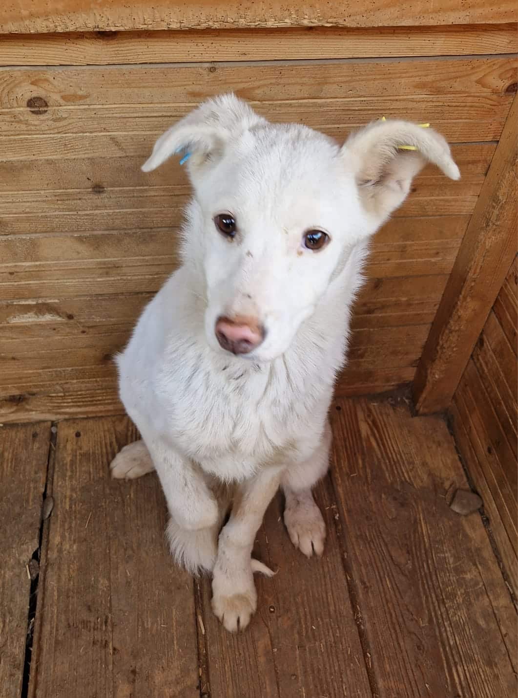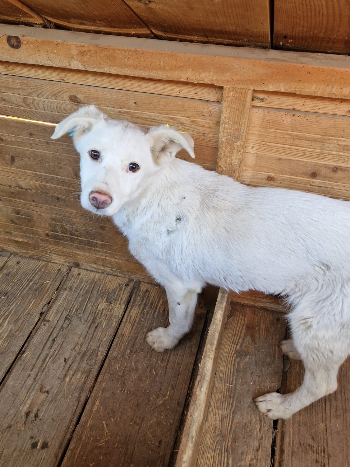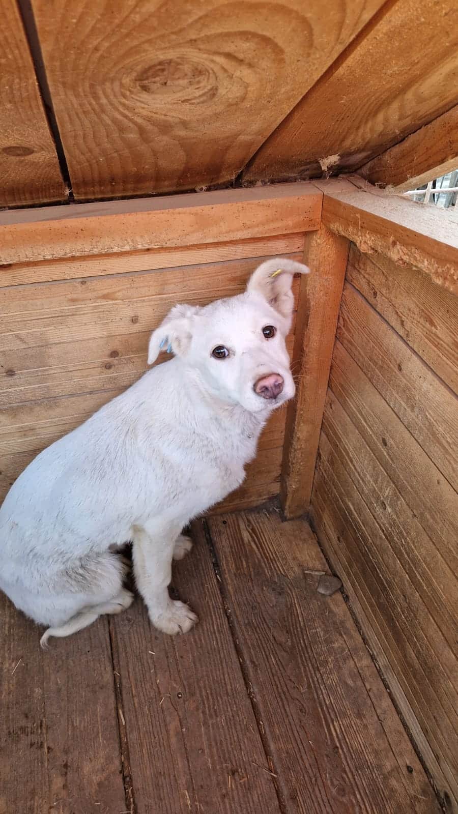 Die hübsche junge UNA saß während unserer Anwesenheit ausschließlich in der Hütte und traute sich nicht raus, sie ist leider schon unsicher und hatte Angst vor uns. Viel Menschenkontakt hatte sie vermutlich nie oder keinen guten. Sie traute sich weder, ein Leckerlie zu nehmen, noch konnten wir sie anfassen. Beim Versuch wich sie direkt aus und beschwichtigte dabei durchgehend.