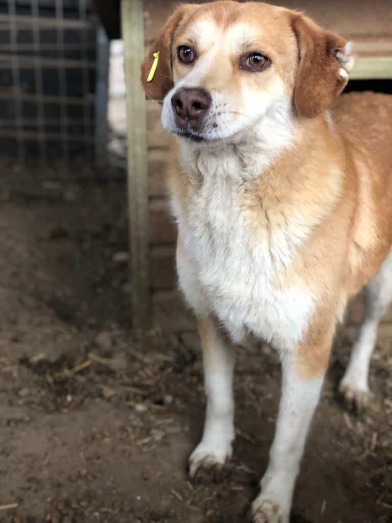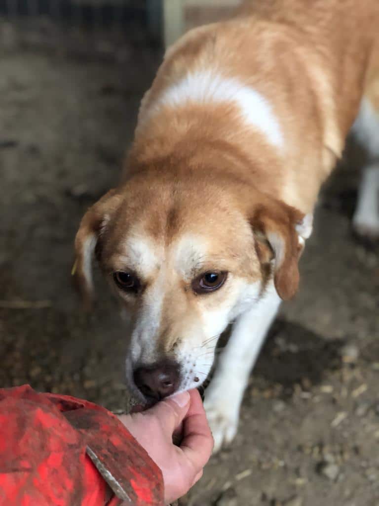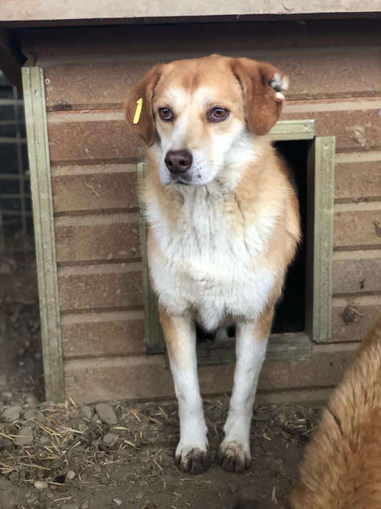URSL ist eine noch sehr vorsichtige und dem Menschen gegenüber ängstliche Hündin. Als wir uns ihrer Hütte näherten hat sie gezittert vor Angst. Trotz alledem konnte sie sich dazu durchringen, Leckerchen von uns zu nehmen. Anfassen ließ sie sich jedoch noch nicht. URSL wird einige Zeit brauchen, um aufzutauen.