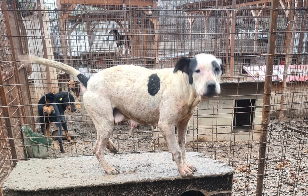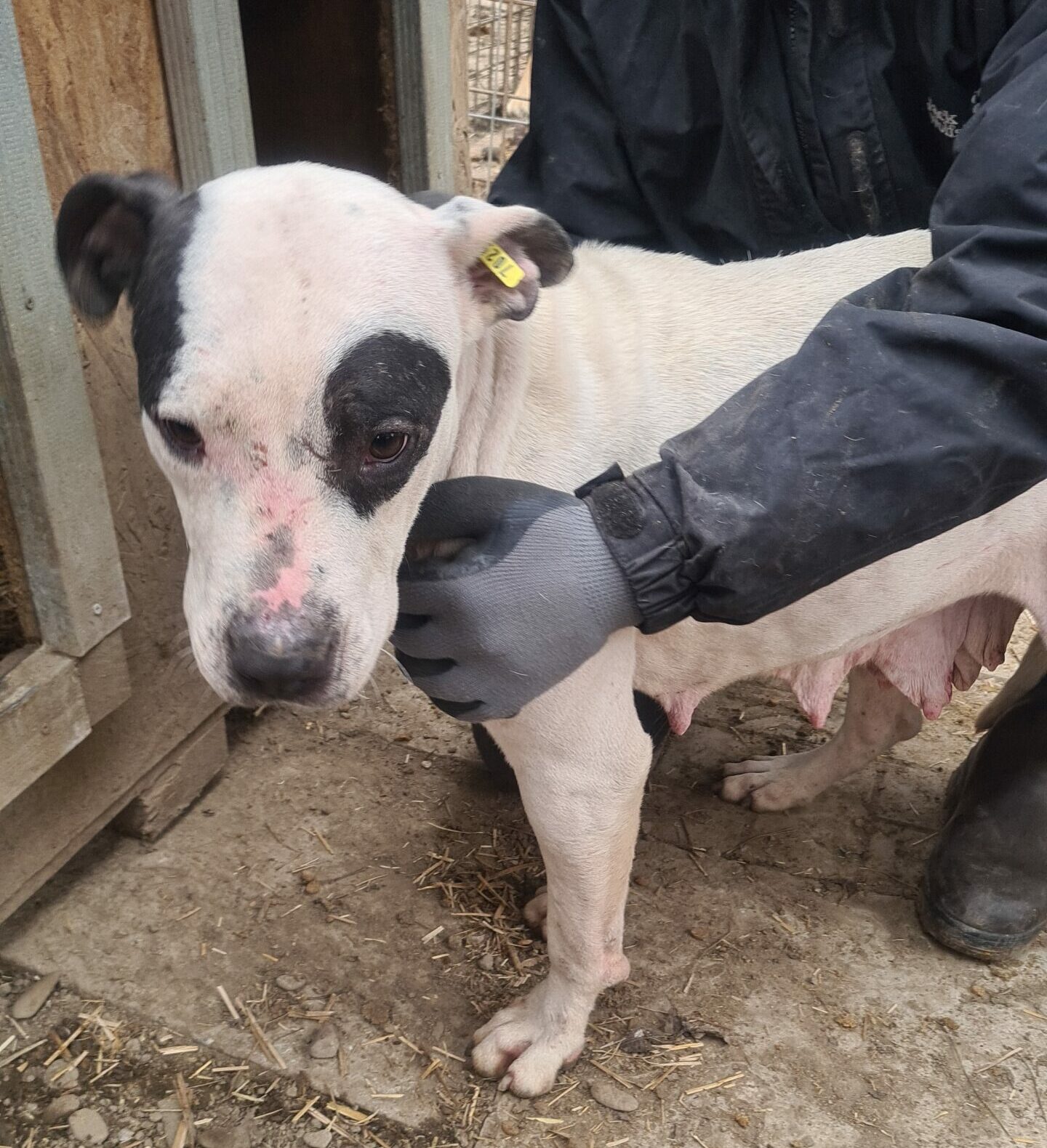 Narben und Wunden überall am Körper, hängendes Gesäuge, wurde wohl als Zuchthund ausgebeutet