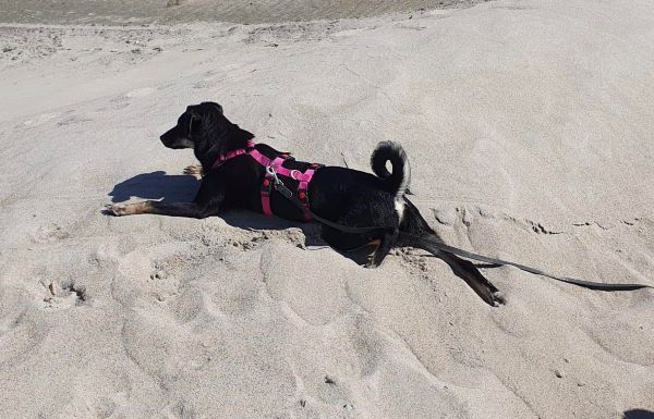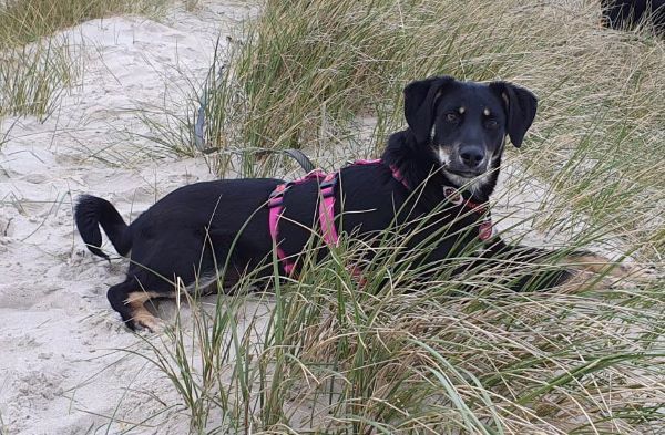 Sie läuft prima an der Leine und andere Hunde, oder Menschenbegegnungen betrachte sie neugierig, aber immer freundlich.