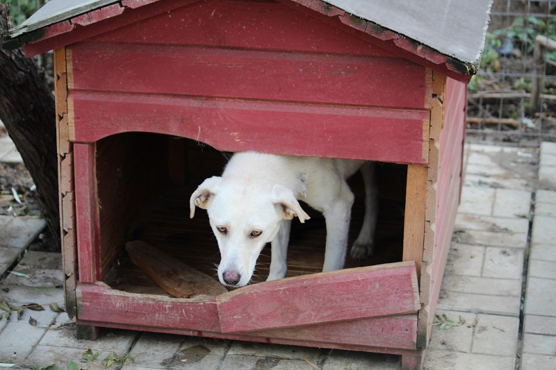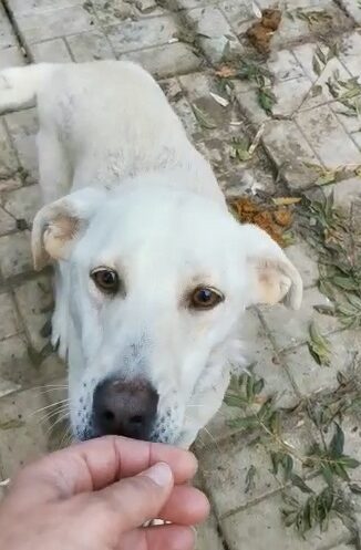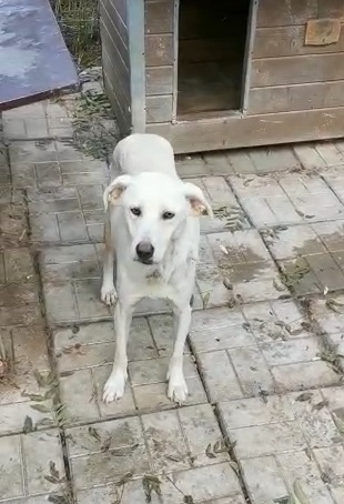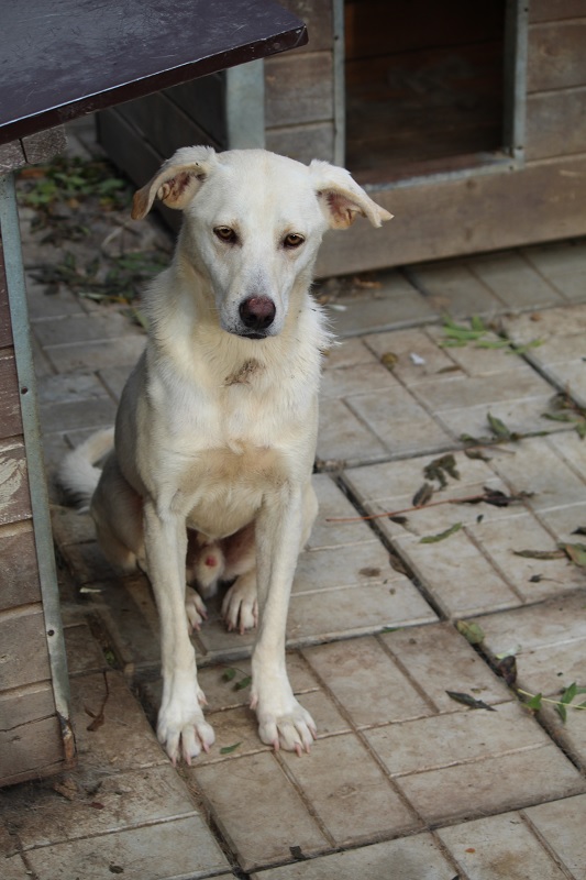 Wir wurden schwanzwedelnd von VITO begrüsst und er wollte auch gleich Leckerli aus der Hand fressen. Er wurde aber dann massiv von einem Kennel-Genossen zurück in die Hütte gedrängt. Dort stand er winselnd und wollte am liebsten zu uns. Aber sobald er rauskam, wurde er wieder barsch zurückgedrängt. Auch zu trinken traut er sich nur in Anwesenheit von Menschen, zudem ist er bereits zu dünn!