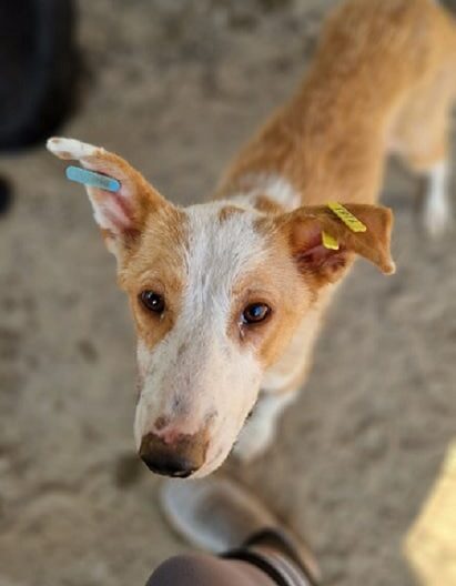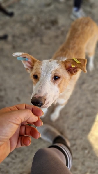 Diese schöne Hündin mit dem netten Gesicht nahm gern unsere Leckerlies und wir konnten sie dann auch vorsichtig an der Schnauze berühren. Sie war die ganze Zeit freundlich. Ihr fehlt nur noch der letzte Schritt, um weiter aufzutauen und sich ganz auf uns einzulassen.