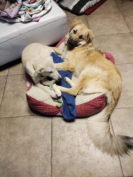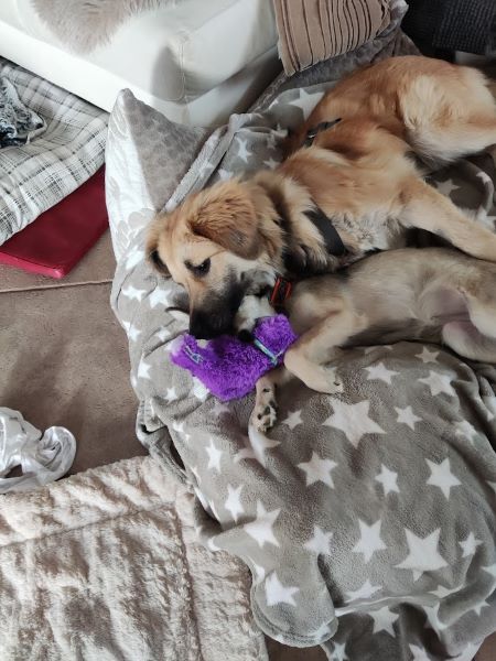 Bei uns zu Hause im Rudel ist sie eine wunderbare Hilfe. Mit der Alphahündin an ihrer Seite begleitet sie die Neuankömmlinge in unser Leben hinein. Dabei ist sie sehr geduldig und lässt sich gerade von den Welpies viel gefallen, ist jederzeit zu einem Spielchen bereit und auch mal etwas Unsinn machen. Und sie bietet ihnen immer ein Plätzchen an ihrer Seite an.