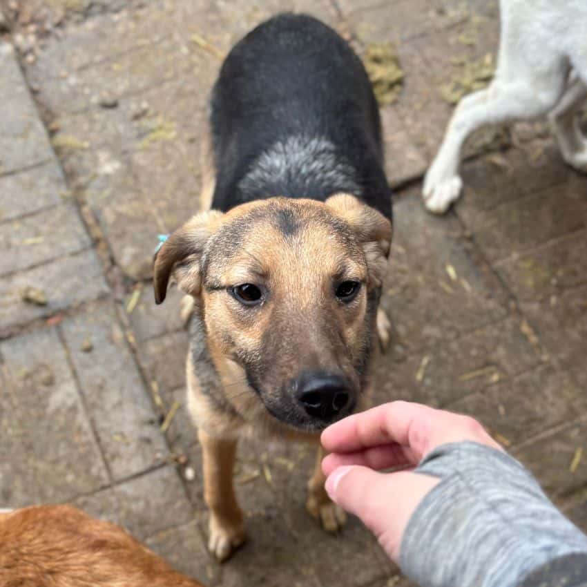 VOLPE freute sich sehr über unseren Besuch und wuselte zusammen mit den anderen Hunden um uns herum. Gerne nahm er unsere Leckerchen und wir konnten ihn dabei vorsichtig an der Schnauze berühren. Zu mehr fehlte ihm der Mut und er wich zurück. VOLPE ist seit Welpe an im Shelter und hat Streicheleinheiten nie kennengelernt. In einer anderen Umgebung sollte dieser letzte Schritt des fehlenden Vertrauens aber bald überwunden sein. Seine neugierige Art wird ihm dabei helfen. Mit den anderen Hunden war er sehr verträglich.