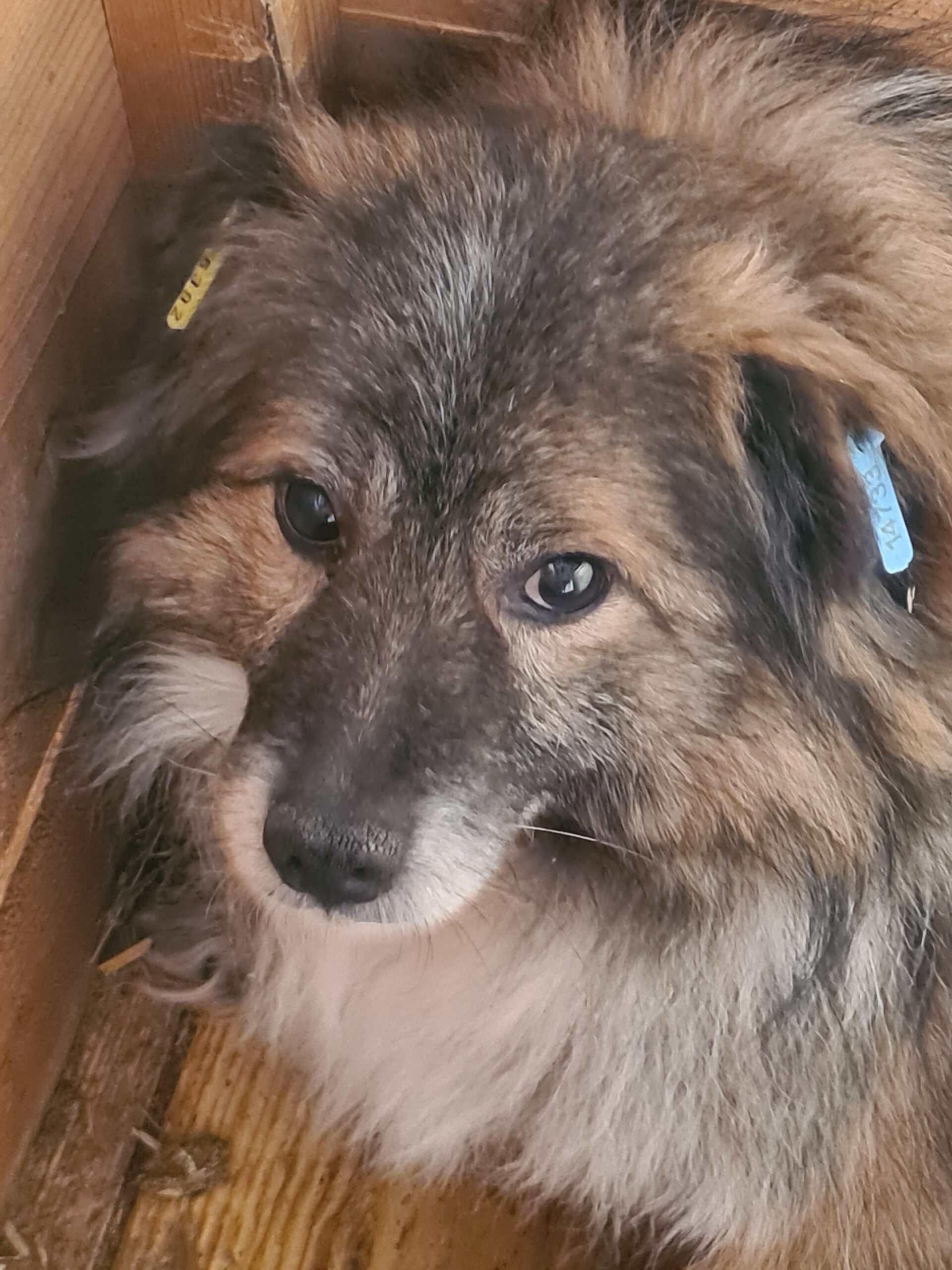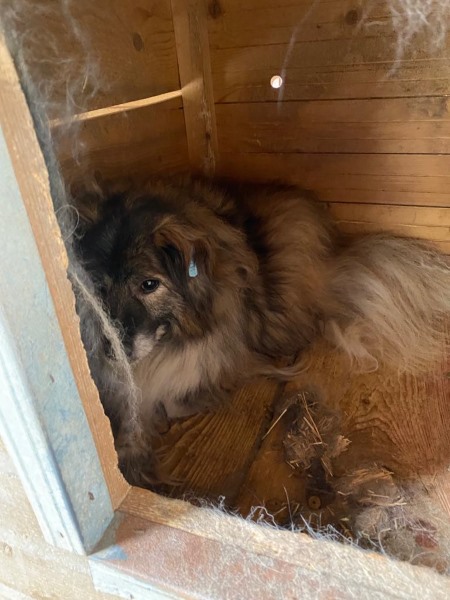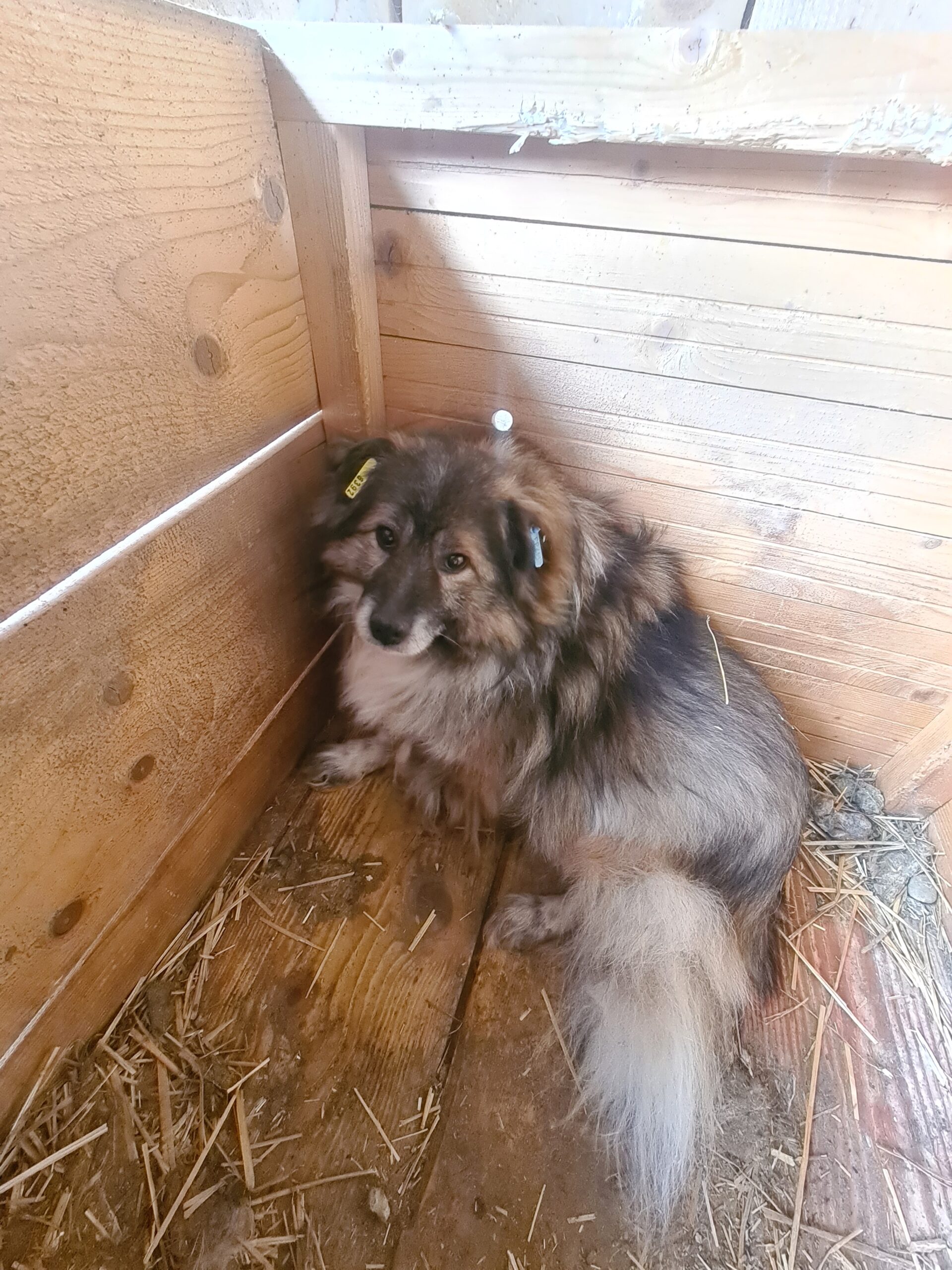 YAEL ist weiterhin unsicher und war nur in der Hütte. Er nahm keine Leckerlies von uns an. Wir konnten ihn dort streicheln und sogar ein wenig seines sehr verfilzten Fells entflusen, er wurde dabei aber steif und wir können nicht ausschließen, dass YAEL bei zu viel Bedrängung nach wie vor schnappen würde. Wir würden uns sehr wünschen, dass sich für den kleinen Rüden endlich ein erfahrener Platz findet.