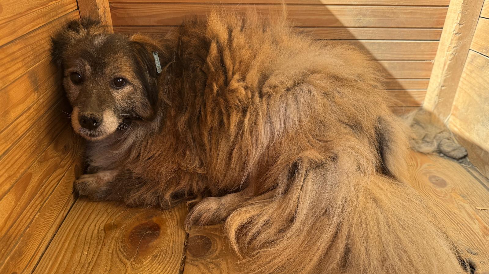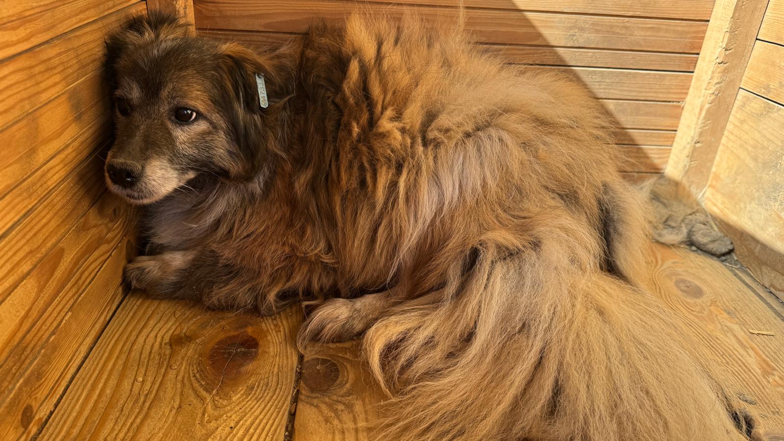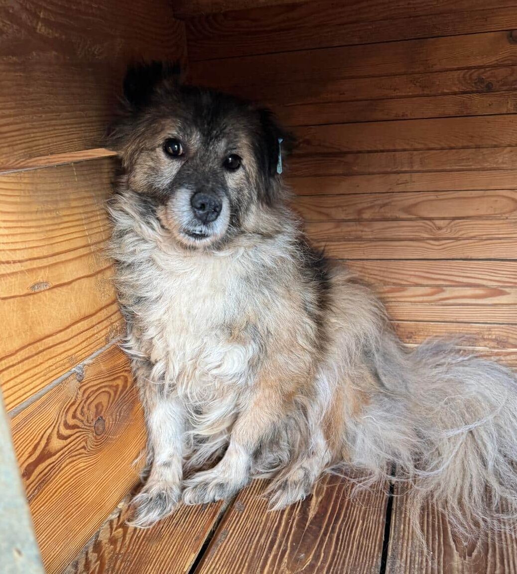 YAEL ist weiterhin unsicher und war nur in der Hütte. Er nahm keine Leckerlies von uns an. Wir konnten ihn dort streicheln und sogar ein wenig seines sehr verfilzten Fells entflusen, er wurde dabei aber steif und wir können nicht ausschließen, dass YAEL bei zu viel Bedrängung nach wie vor schnappen würde. Wir würden uns sehr wünschen, dass sich für den kleinen Rüden endlich ein erfahrener Platz findet.