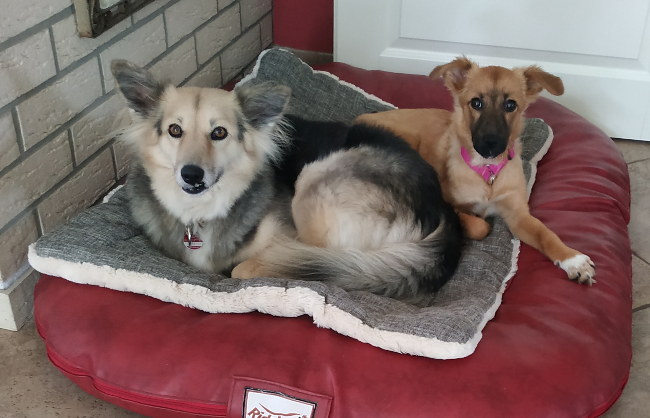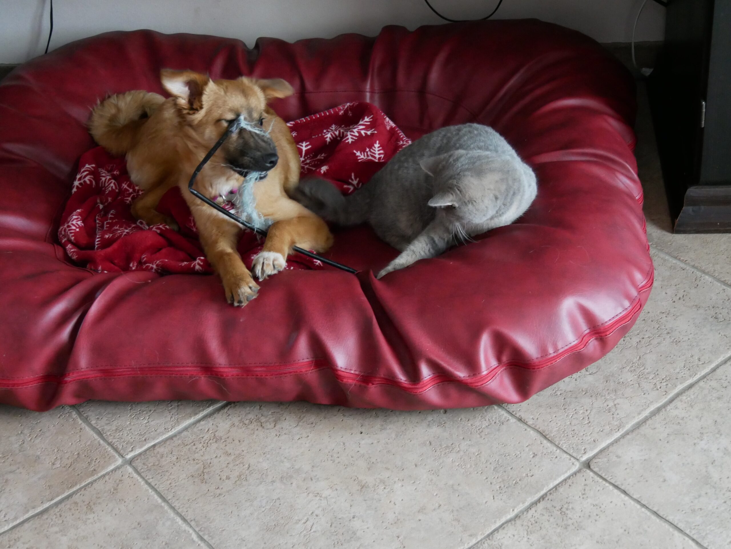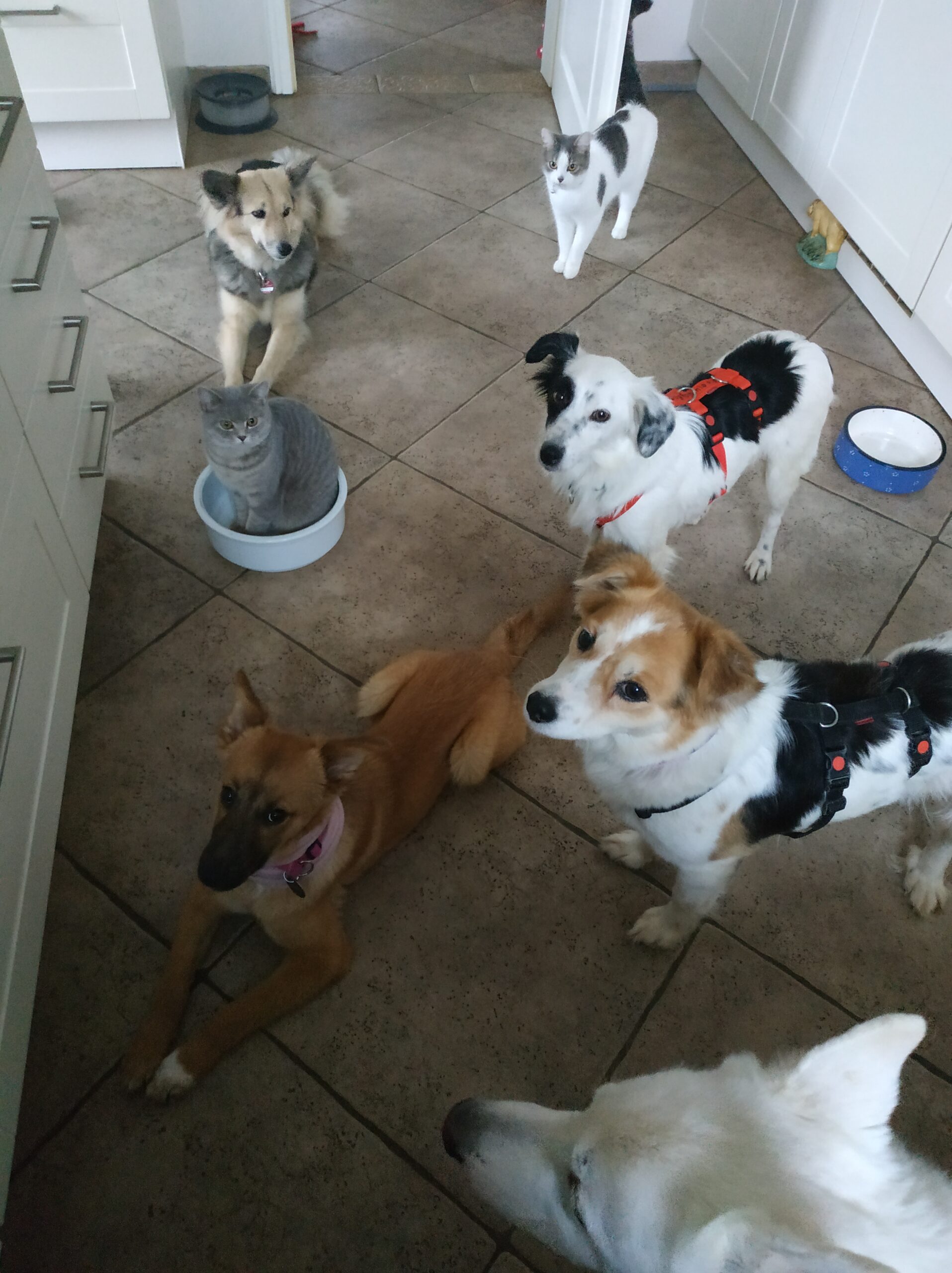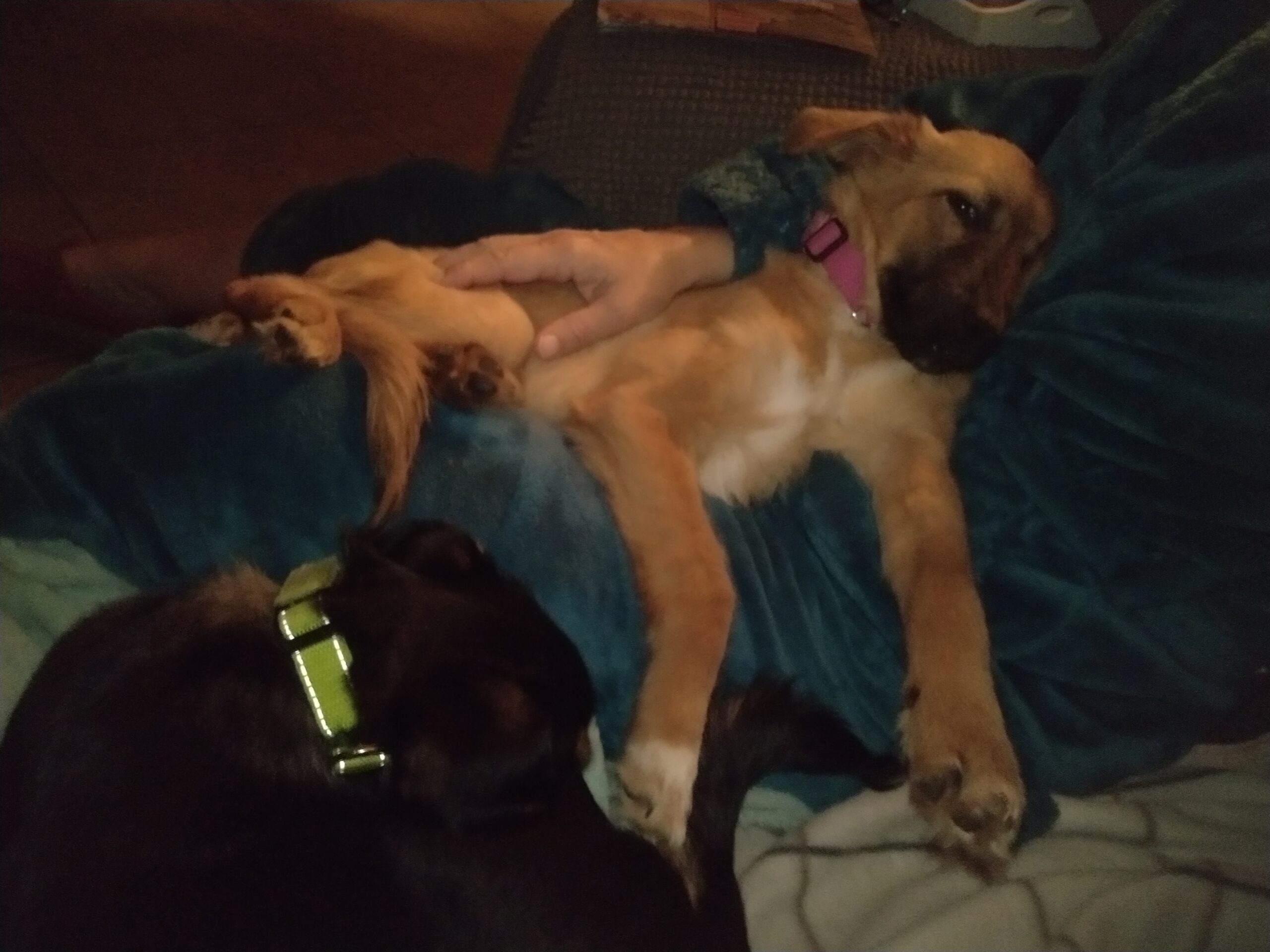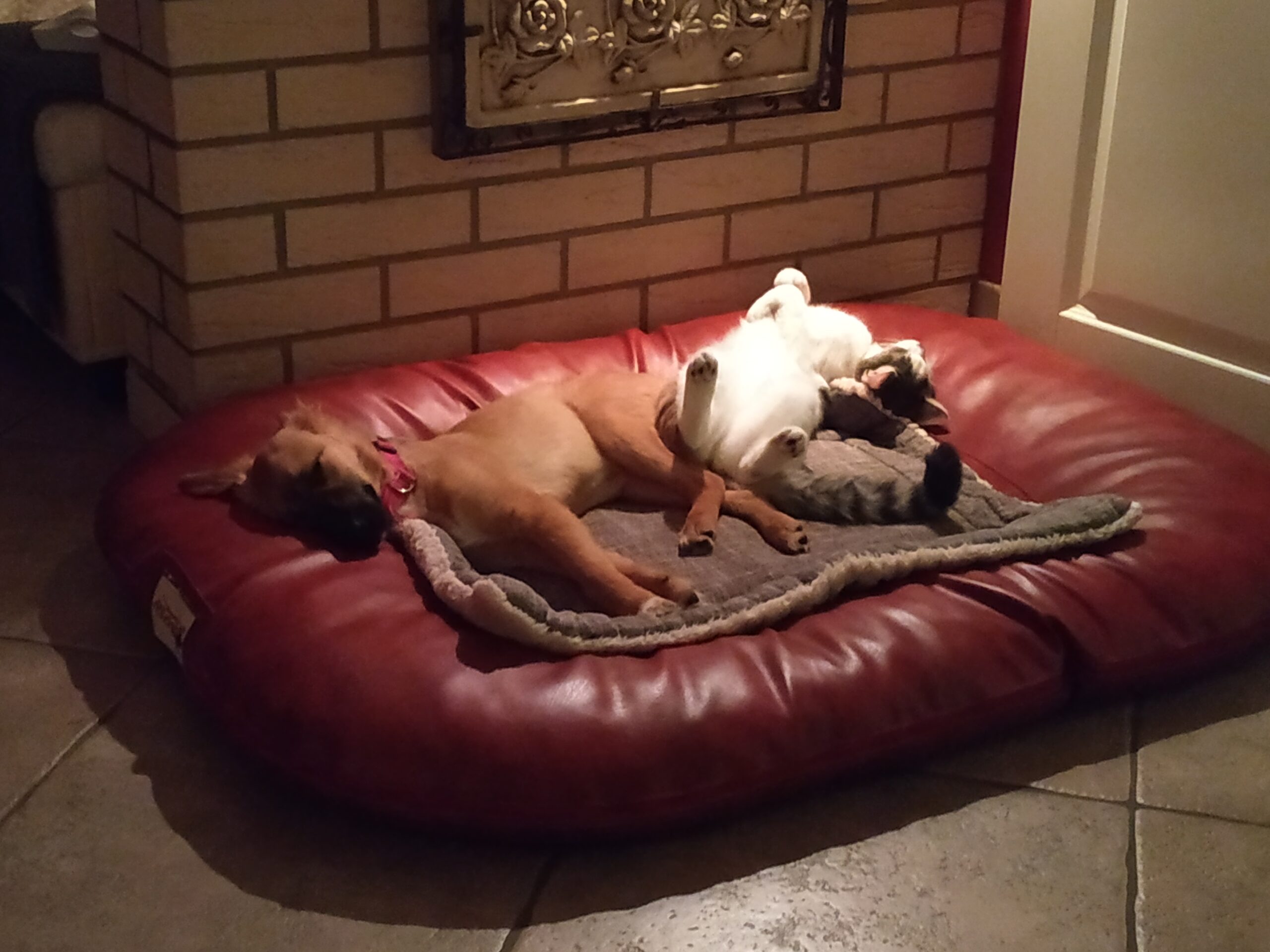 Im Haus ist sie ruhig, kann gut runterkommen, Bürozeiten werden ordnungsgemäß eingehalten. Die Körbchen werden gerne genutzt und auch mit ihren PS-Geschwistern oder den Katzen geteilt. Am allerliebsten allerdings mit dem Pflege-Frauchen; Körperkontakt und Kuscheln muss unbedingt sein. Ein unbeschreibliches Gefühl, das Herz wird einem warm, wenn dieser kleine, immer noch recht zarte Körper sich vertrauensvoll an einen schmiegt und man spürt – hier ist die Welt für sie in Ordnung, hier fühlt sie sich sicher.