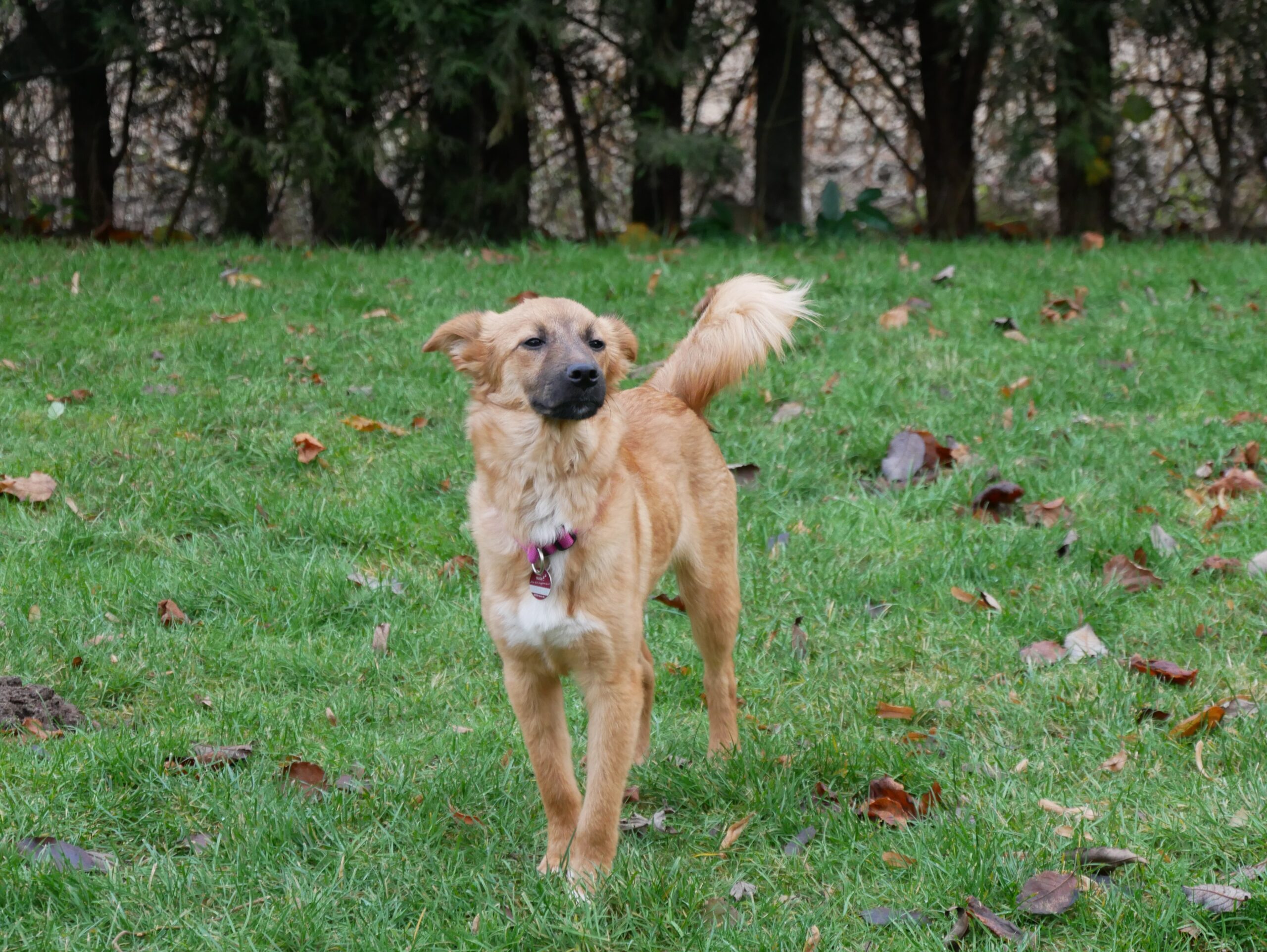 Hundebegegnungen werden neugierig angegangen; bei zu forschem Gegenüber tritt sie den Rückzug an, ansonsten ist sie freudig interessiert.