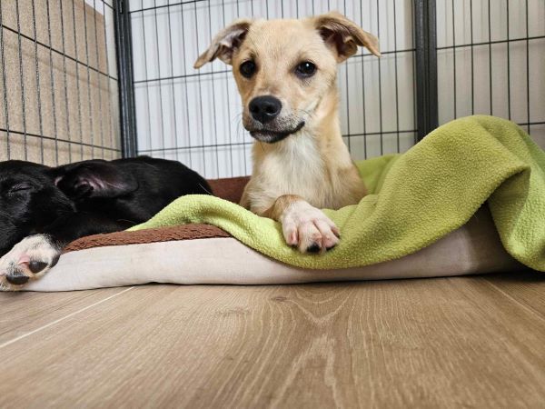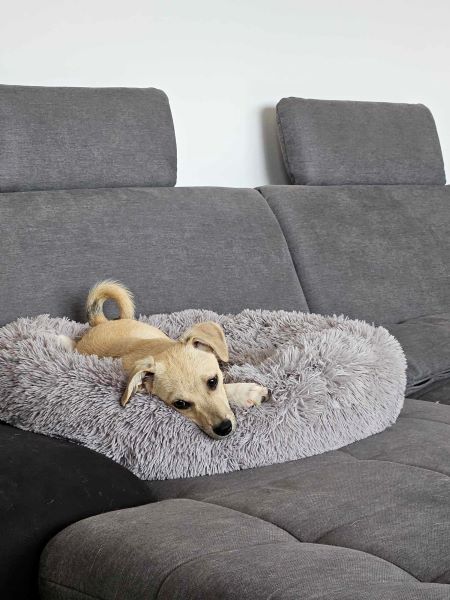Yoki bleibt in Gesellschaft anderer Hunde mehrere Stunden alleine Zuhause. Das sollte aber im neuen Zuhause wieder kleinschrittig aufgebaut werden und nicht die Regel sein.