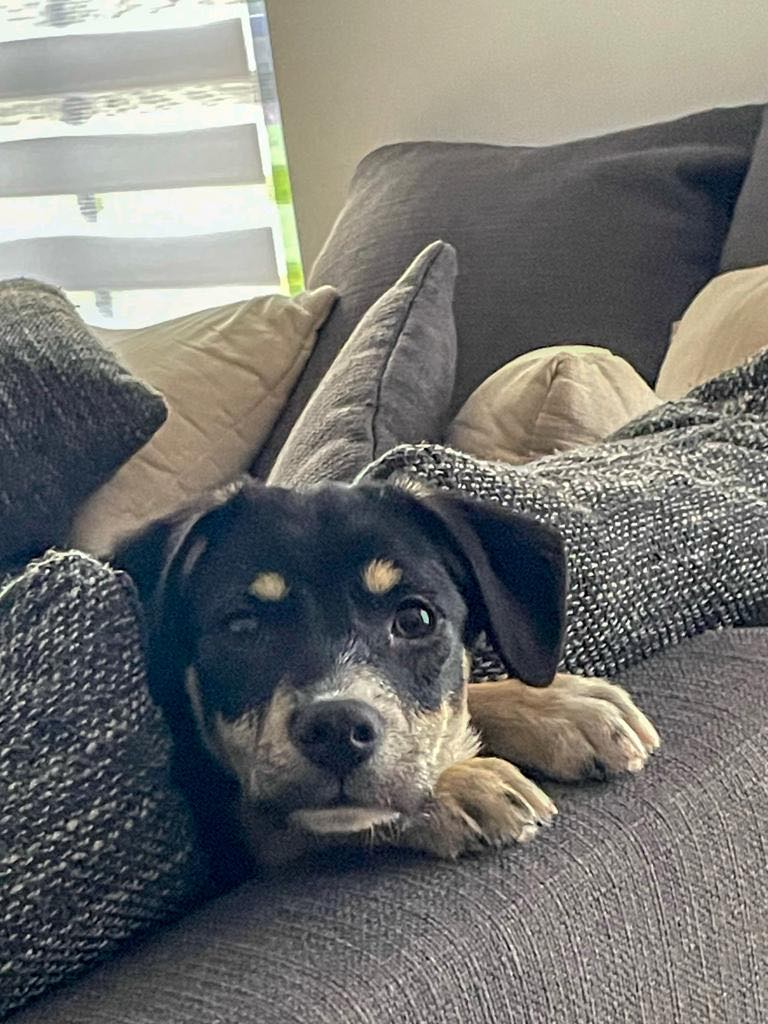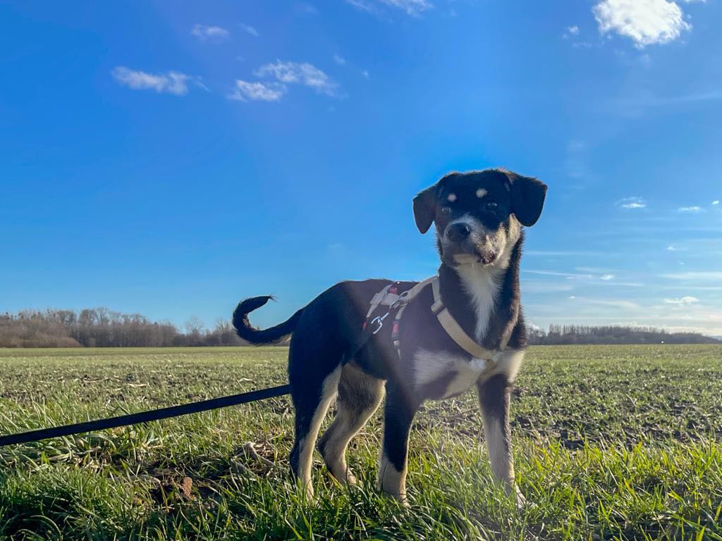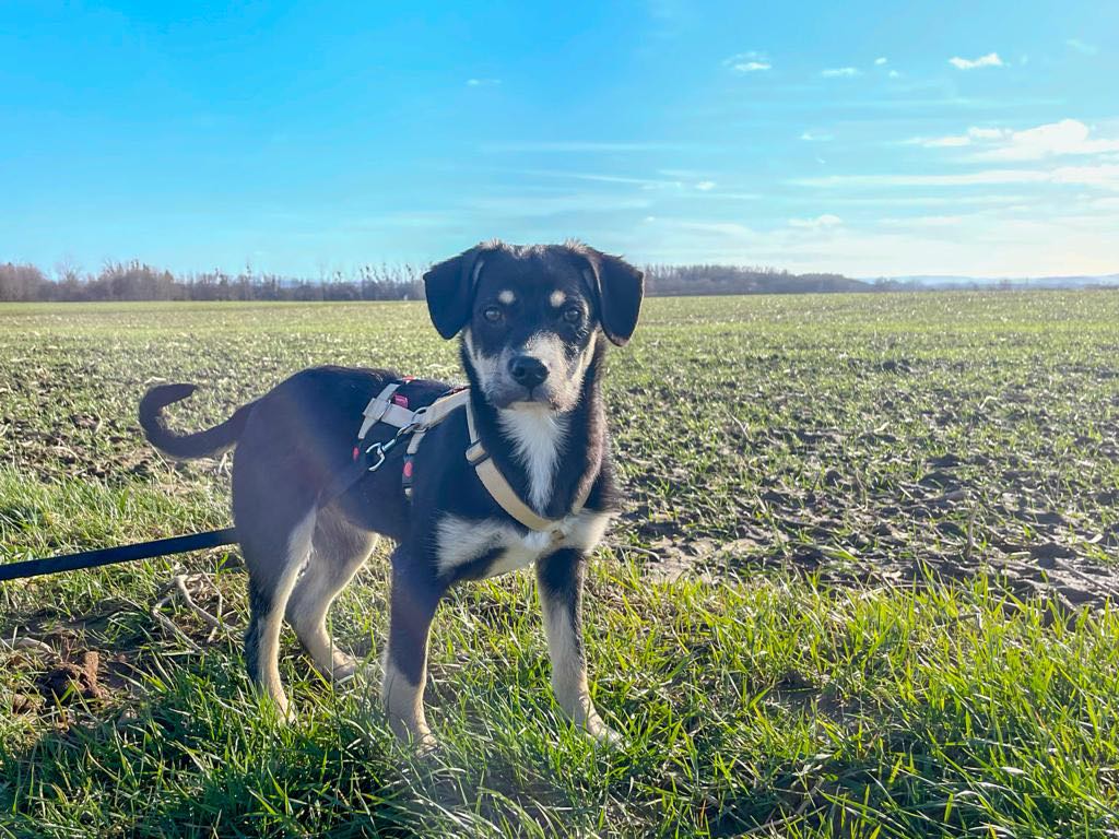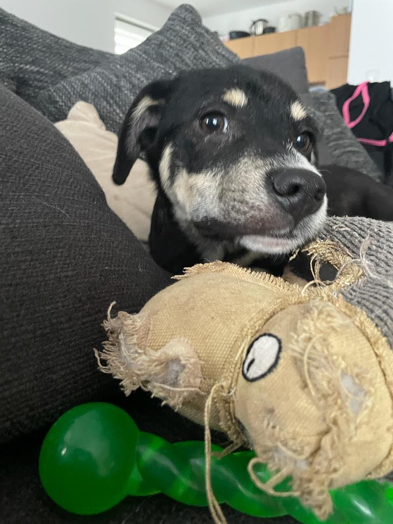 Ich habe in so kurzer Zeit schon so viel gelernt, ich fahre problemlos im Auto mit, laufe Treppen wie ein Profi und bin natürlich Welpen typisch verspielt und mit jedem verträglich.