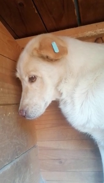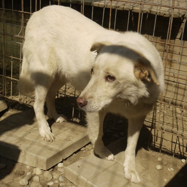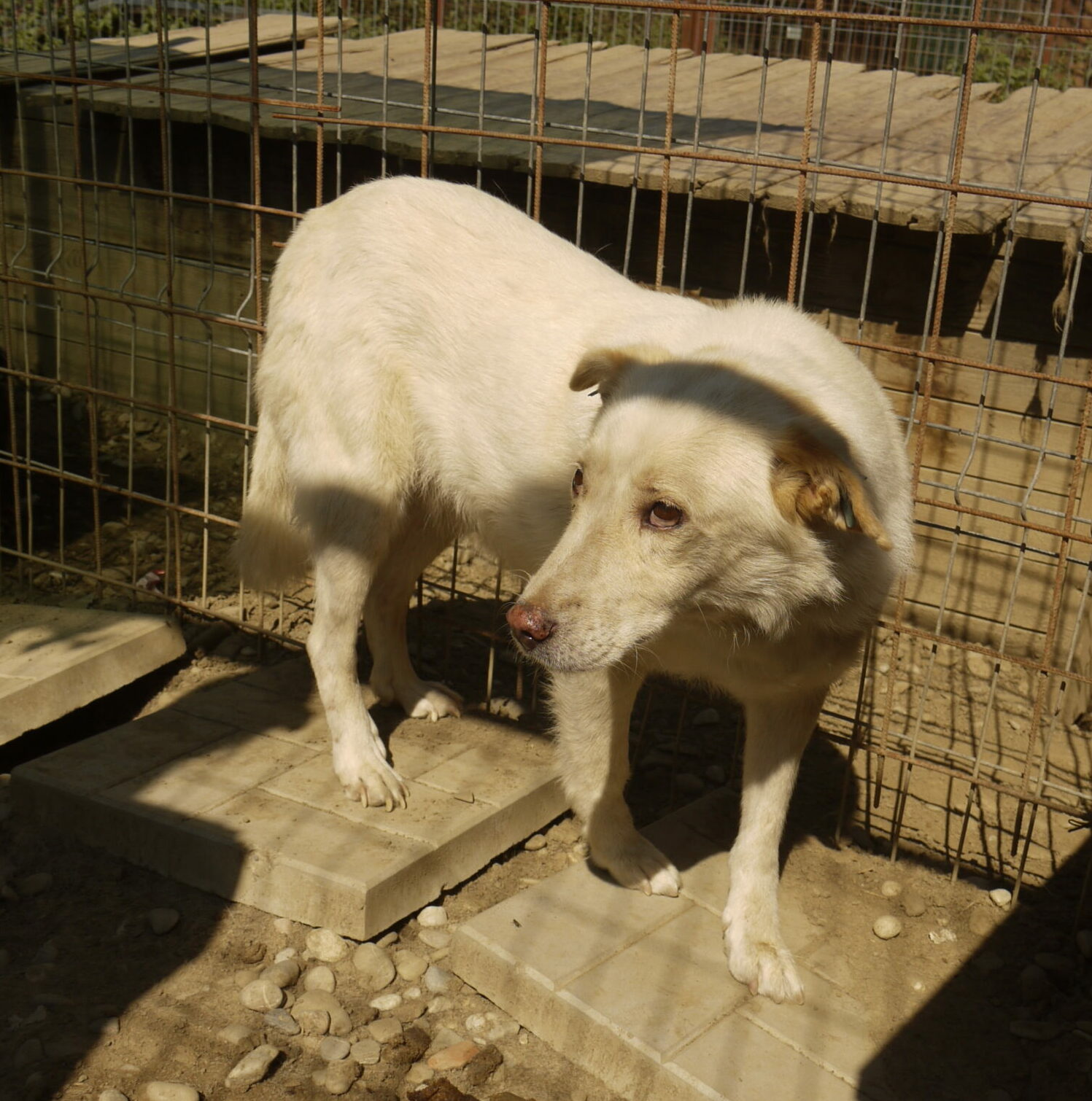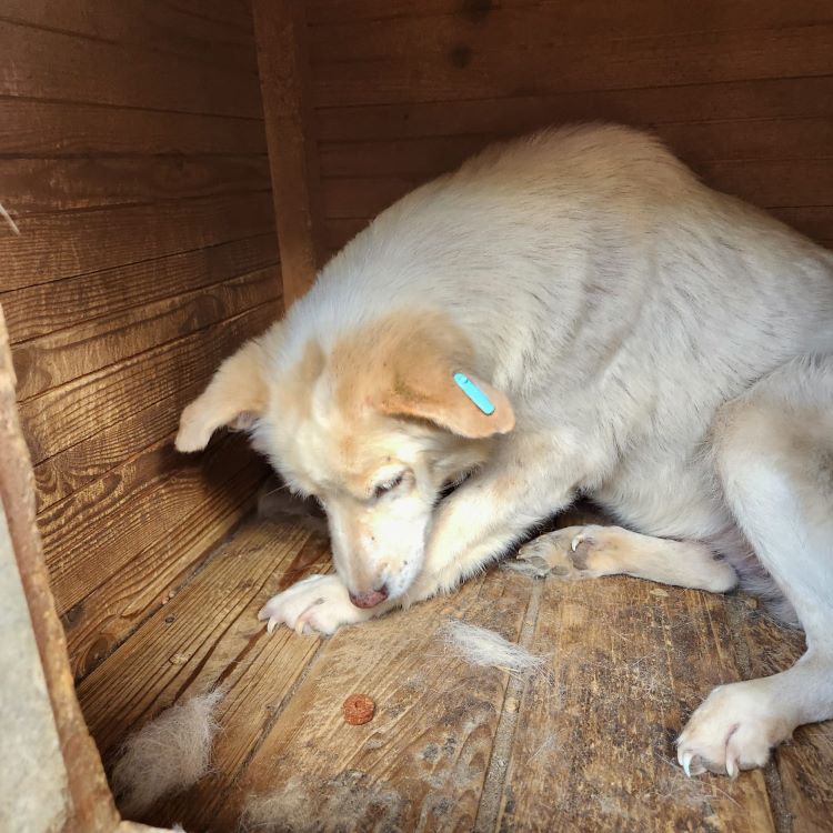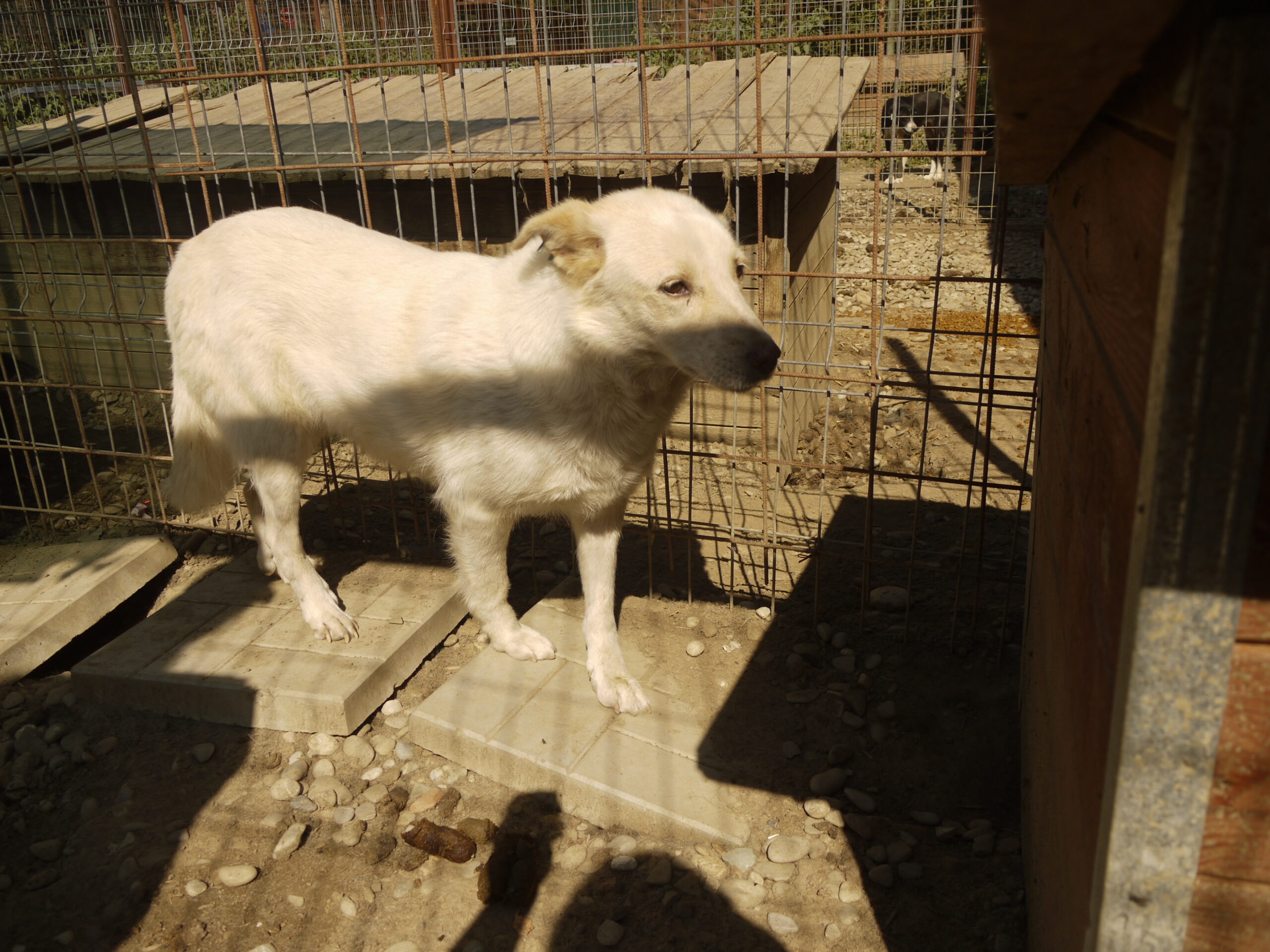 YORUBA ist eine schüchterne, devote Hündin, die sich nicht traute uns in die Augen zu schauen. Sie scheint vollkommen resigniert und hat während unserer Anwesenheit kein einziges Mal die Hütte verlassen. Zögerlich nahm sie die angebotenen Leckerchen vom Boden auf und ließ sich mit der falschen Hand auch streicheln. Ihren Blick wandte sie aber immer wieder in Richtung Hütte, um uns auszuweichen. Eine sehr ruhige, zarte Hündin, die mit dem Trubel im Shelter komplett überfordert scheint.
