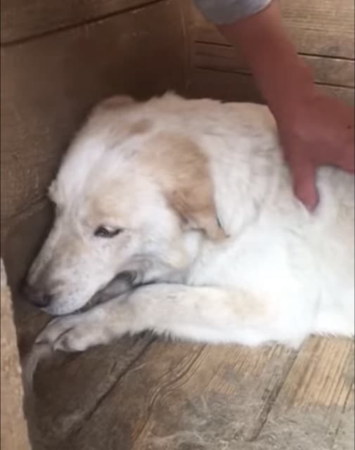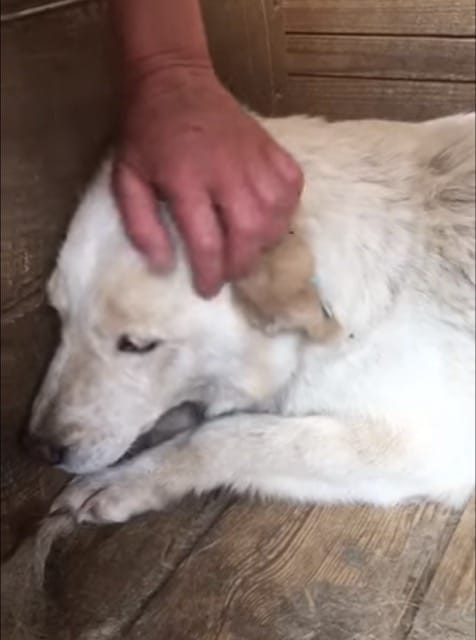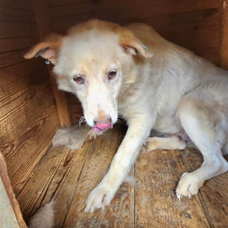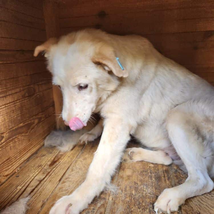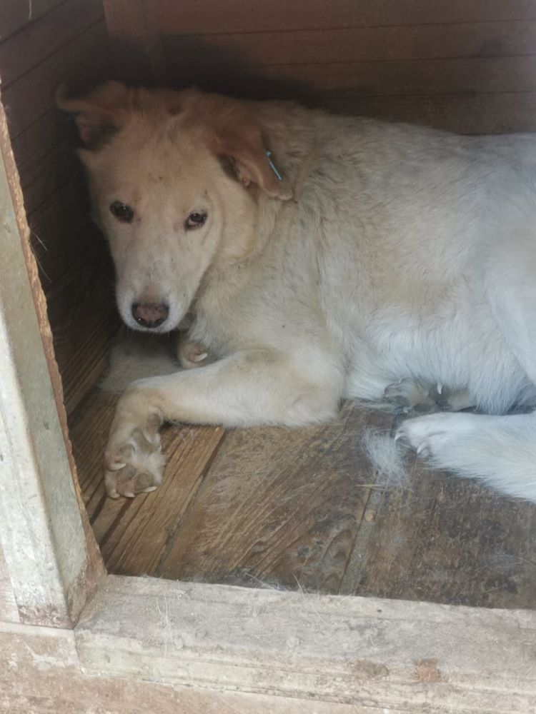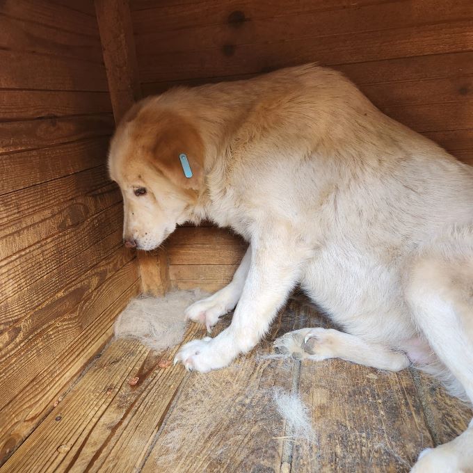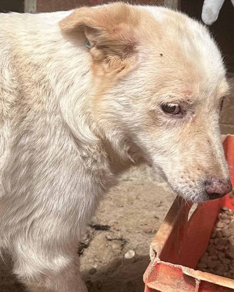 YORUBA ist eine schüchterne, devote Hündin, die sich nicht traute uns in die Augen zu schauen. Sie scheint vollkommen resigniert und hat während unserer Anwesenheit kein einziges Mal die Hütte verlassen. Zögerlich nahm sie die angebotenen Leckerchen vom Boden auf und ließ sich mit der falschen Hand auch streicheln. Ihren Blick wandte sie aber immer wieder in Richtung Hütte, um uns auszuweichen. Eine sehr ruhige, zarte Hündin, die mit dem Trubel im Shelter komplett überfordert scheint.