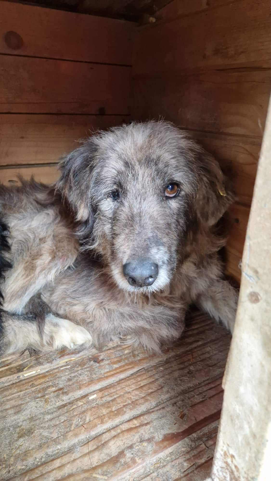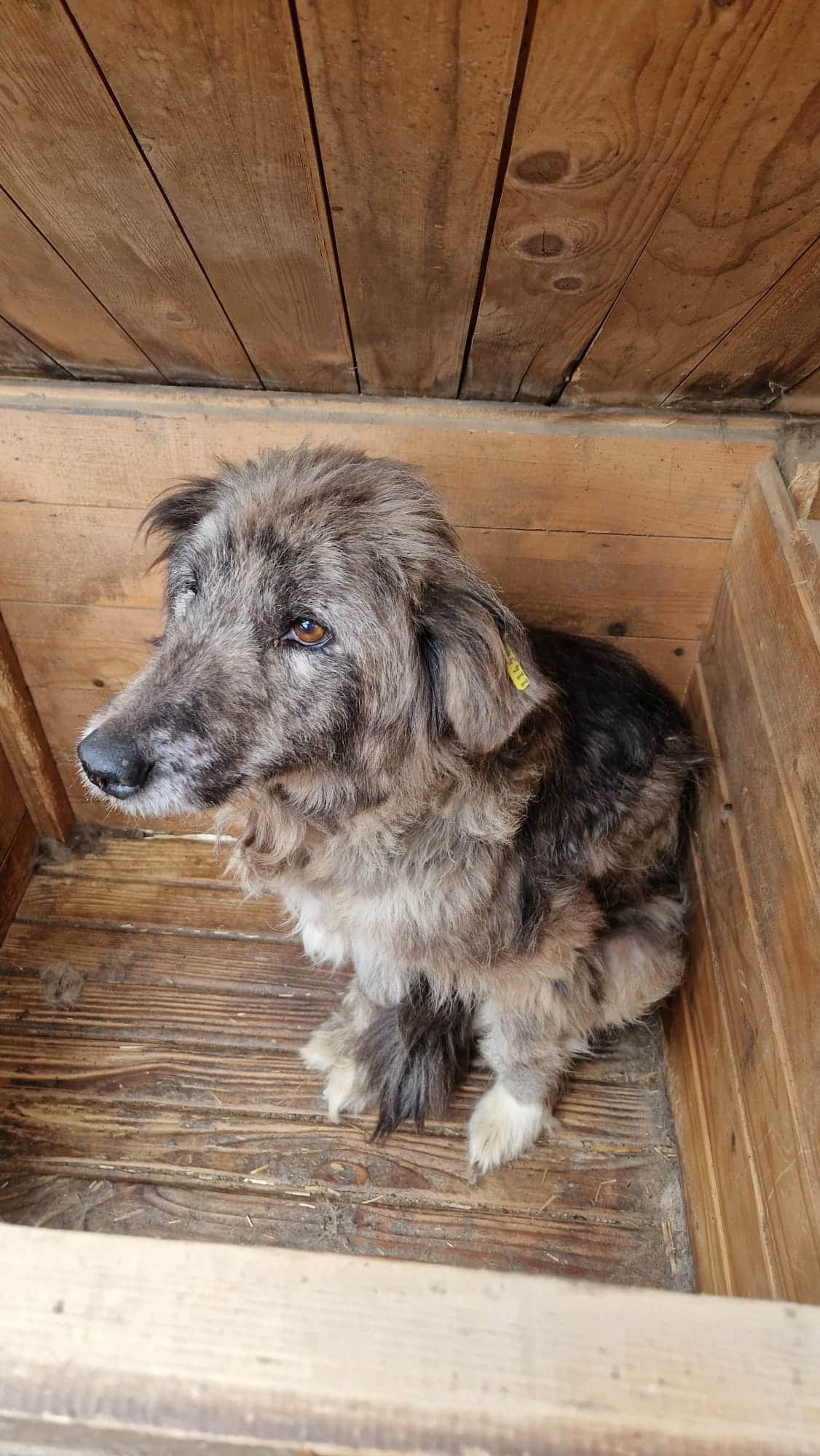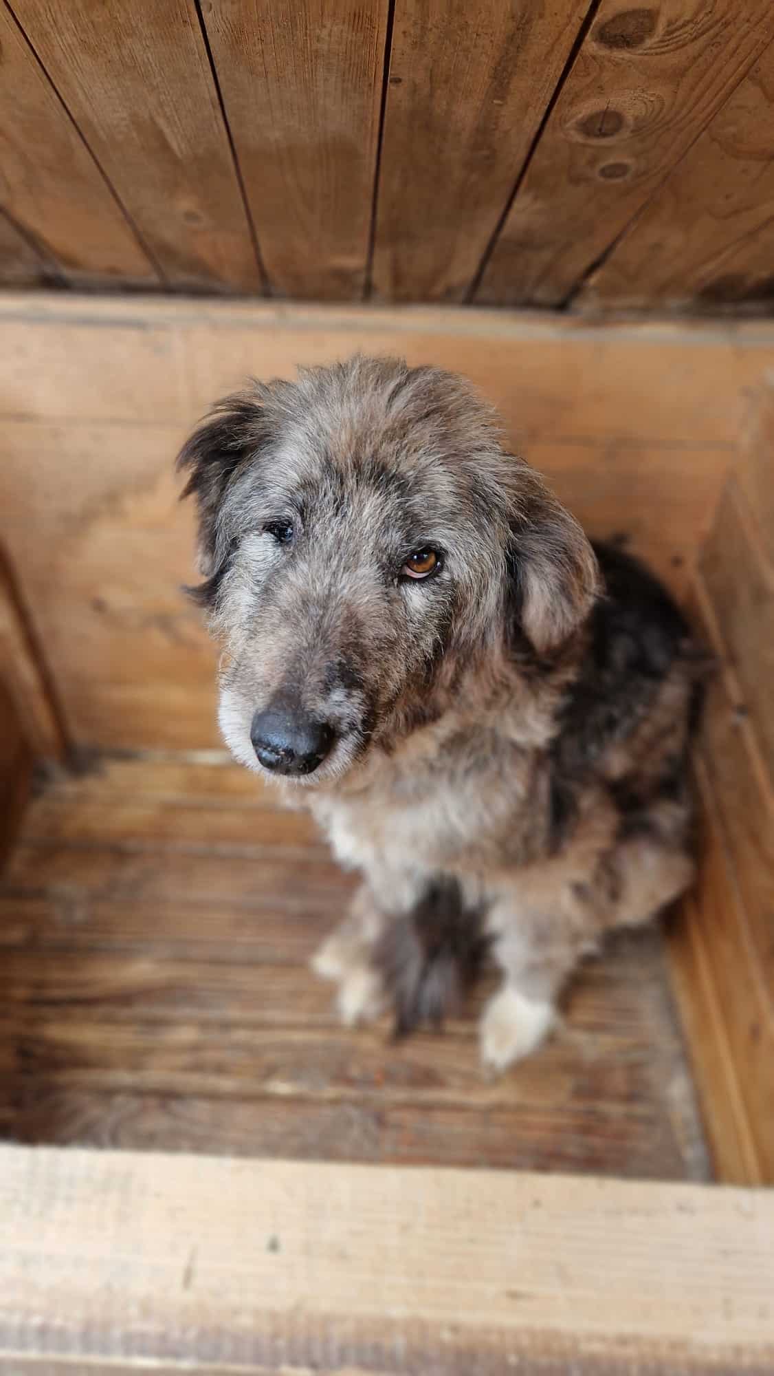 Diese nette, leider viel zu dünne alte Hündin lag nur in der Hütte und suchte anfangs keinen Kontakt zu uns. YURA scheint nichts mehr vom Leben zu erwarten. Unsere Leckerlis nahm sie dann aber gerne und wurde dann auch insgesamt interessierter, als wir ihr etwas Zeit schenken konnten. Sie ließ sich gut anfassen, ist aufgrund ihres Alters vom Wesen her schon ruhig und zeigte sich auch verträglich. YURA wollte ihre Hütte nicht verlassen, deshalb konnten wir nicht sehen, wie gut sie noch laufen kann.
