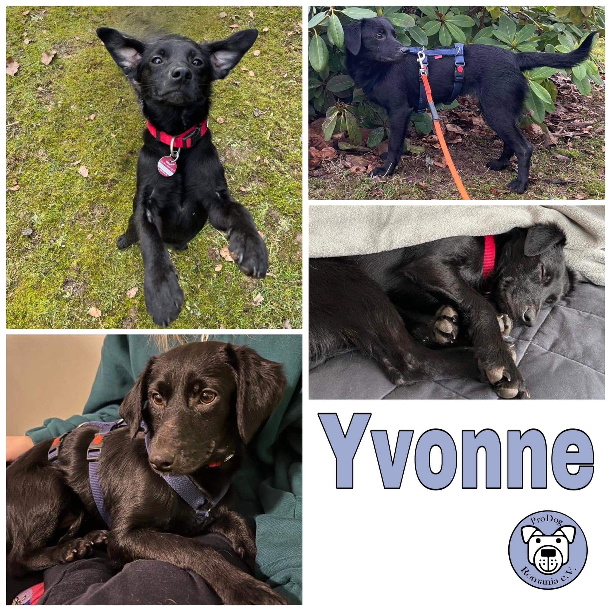 Yvonne ist ein Herzchen. Wenn sie morgens mit ihrem fröhlichen Lächeln und ewig wackelndem Schwänzchen um die Ecke kommt, haben wir auch gleich gute Laune. Stubenrein ist sie noch nicht, wenn gleich auf einem guten Weg, aber zb bei stürmischem Regen zieht sie es dann doch lieber vor, im Warmen ihr Geschäft zu verrichten.