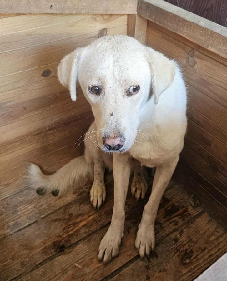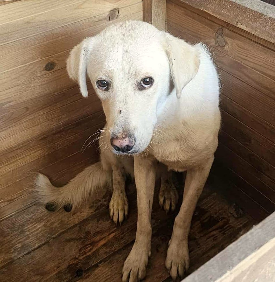 ZEUS zeigt sich freundlich, ist jedoch noch unsicher. Er zieht sich in seine Hütte zurück, um dort Schutz zu suchen. Der Stress im Shelter mit den vielen Hunden, der Enge und dem Lärm machen ihm Angst.