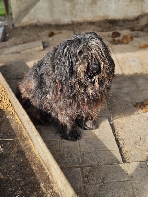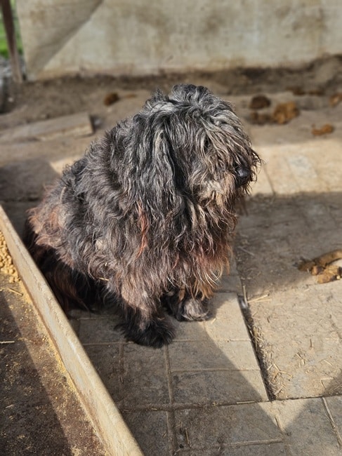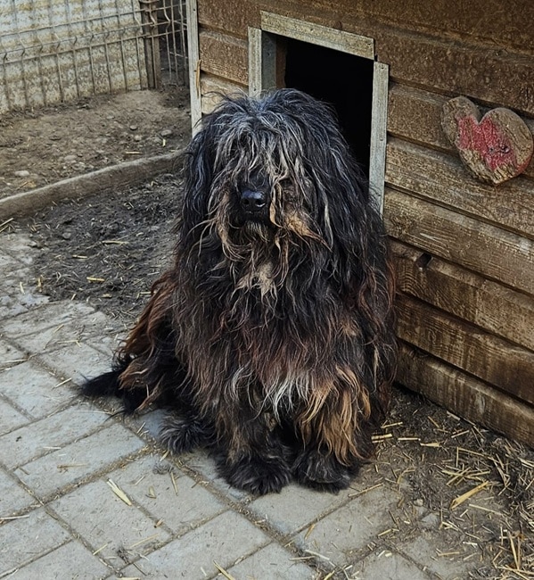 Dieser Wuschel beobachtete uns neugierig, während wir uns mit den anderen Hunden beschäftigten. Er scheint bereits älter zu sein, hat sehr schlechte Zähne und ist völlig verfilzt. Die hingeworfenen Leckerchen nahm er nicht. Unsere Aufmerksamkeit war zu ungewohnt und so zog er sich in die Hütte zurück. Allerdings ist er nicht wirklich panisch, er beobachtet uns erstmal relativ ruhig. Wir konnten in seinem Maul sehr viele kaputte, fehlende Zähne und vor allem viele „vergammelte“ Zähne sehen. Wir nehmen sehr stark an, dass unser Wuschelhund ziemlich starke Schmerzen hat. Vielleicht ist das auch ein Grund, warum er noch keinen Kontakt sucht. Zudem stand immer die Chefin der Gruppe vor ihm. Die zuständige Tierärztin wurde über seine Zähne informiert.