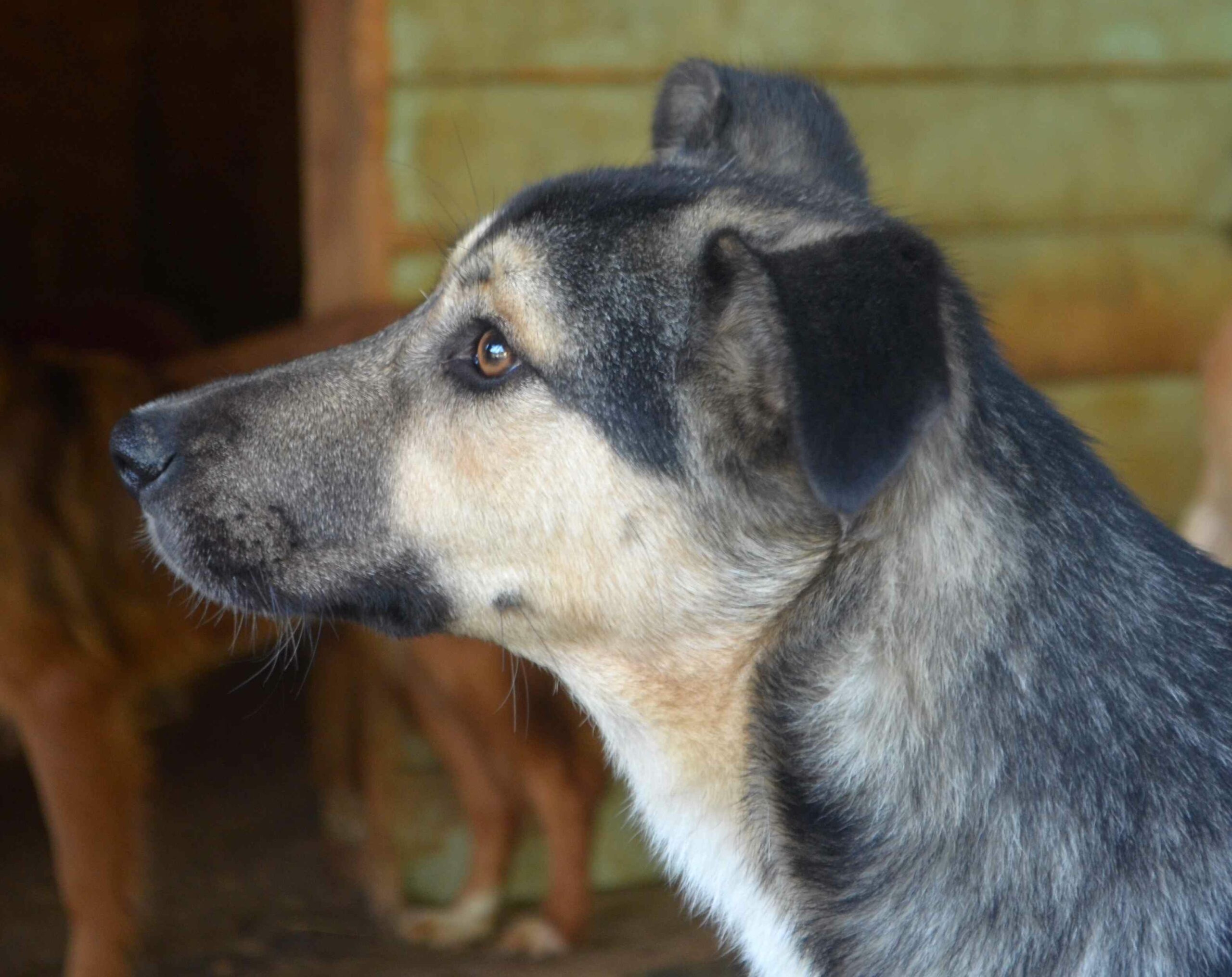 ZURI zeigte sich bei unserem Besuch unsicher. Sie zog sich in ihre Hütte zurück. Dort war sie unter Bedrängung auch anfassbar. Genießen konnte sie es jedoch nicht. Berührungen durch den Menschen sind ihr fremd. In der Hundegruppe wirkte sie verträglich.