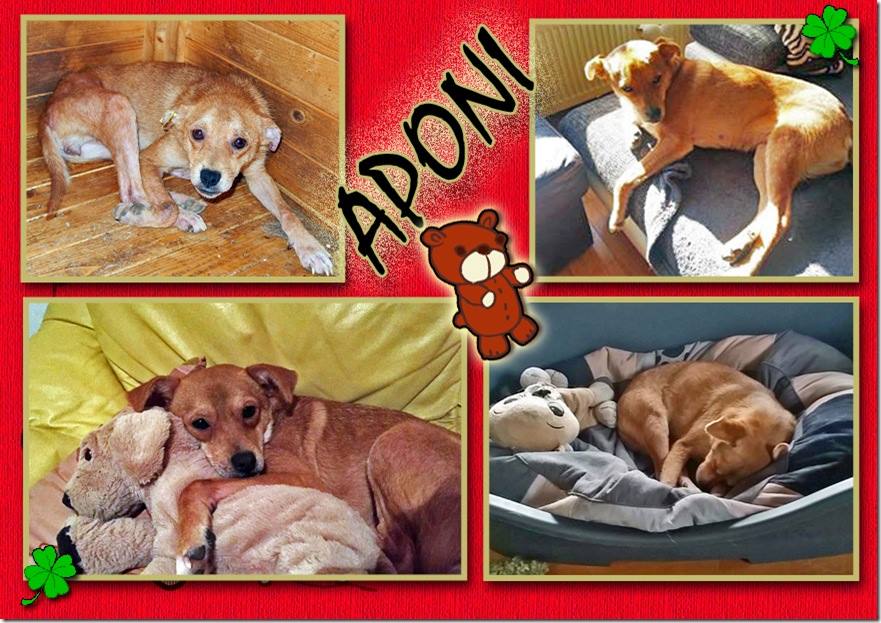 Aponi war Straßenhund in Rumänien und wurde durch Hundefänger eingefangen und ins Tierheim Ploiesti gebracht. Dort war sie nach meinen Infos ca. 1 Jahr, bis meine Freundin Angelika Ulrich sie als Pflegehund bei sich aufnahm. Ich war sofort verliebt in sie und beschloß Aponi ein Zuhause zu schenken. Anfangs hatte die Kleine furchtbare Angst vor allem: Autos, fallende Blätter, Hunde, Hausflure und Menschen, ganz besonders vor Männern. Inzwischen habe ich eine fröhliche, mutige Maus. Aponio ist gelehrig, freundlich und auf dem besten Weg resozialisiert zu sein. Frei ohne Leine kann ich sie leider nicht laufen lassen, da sie einfach losmarschiert wenn ihr eine Situation langweilig wird (Spiel mit anderen Hunden zB.) Sie wedelt auf Zuruf ganz freundlich, lächelt und geht ihres Weges. Ich bin schwer verliebt in diesen fröhlichen wunderbaren Hund.