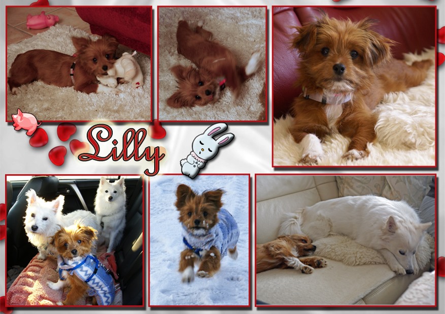 Unsere Lilly kommt aus Ploiesti und hiess in ihrem früheren Leben Angie. Die kleine Hundedame hat mit ihrem zuckersüssen Aussehen sofort alle im Sturm erobert. Auf der Hundewiese sind alle begeistert von ihr und alle würden sie am liebsten mit nach Hause nehmen. Aber wir geben sie nicht mehr her. Sie lebt mit zwei anderen Hunden, meiner Hündin Flocki, Mittelspitz (mit der sie den ganzen Tag tobt und kuschelt und ihr alles nachmacht – große Schwester halt) und dem Westi meiner Eltern und meiner Katze Kessy zusammen. Der Mieze frisst die freche Maus immer alles weg und ärgert sie auch manchmal, aber sie lieben sich trotzdem. Wenn sie zusammen in einem Körbchen kuscheln, ist alles vergessen.