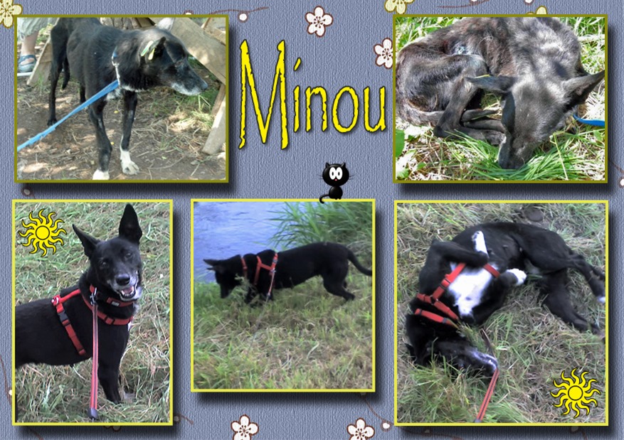 Anfang Juli 2015 war ich für 10 Tage mit einer Freundin im Shelter Bucov in Ploiesti, um dort zu helfen. In diesen Tagen wurde Minou von den Hundefängern aufgegriffen und ins Shelter gebracht, völlig geschwächt und dehydriert, nur noch Haut und Knochen. Wir versuchten sie „aufzupäppeln“, aber sie hatte sich aufgegeben und kam (glücklicherweise) in die Klinik von Vet Popescu, wo es ihr tatsächlich nach ein paar Tagen etwas besser ging.
